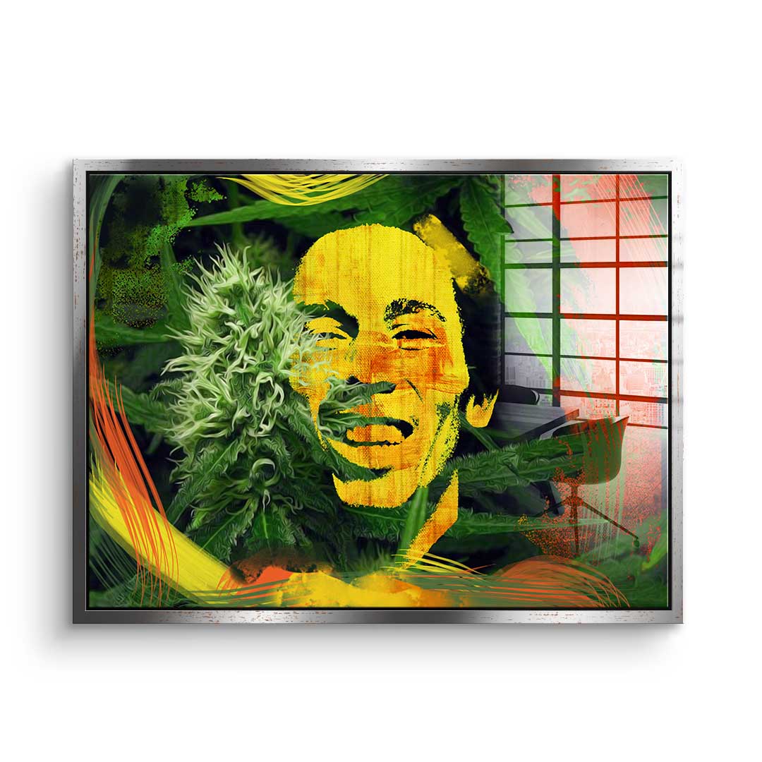 DOTCOMCANVAS® Premium Acrylglasbild im Pop Art Stil mit Pop-Ikone und Cannabis-Motiv in Grün, Rot und Gelb.