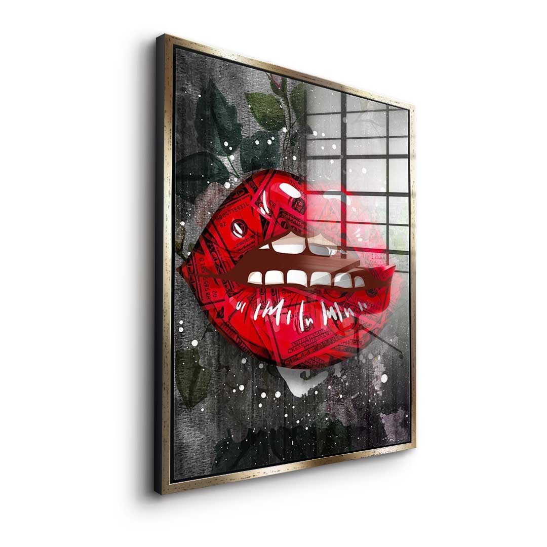 DOTCOMCANVAS® Premium Acrylglasbild im Pop Art Stil mit rotem Kussmund, floralem Hintergrund und Dollar-Muster in schwarz und rot.