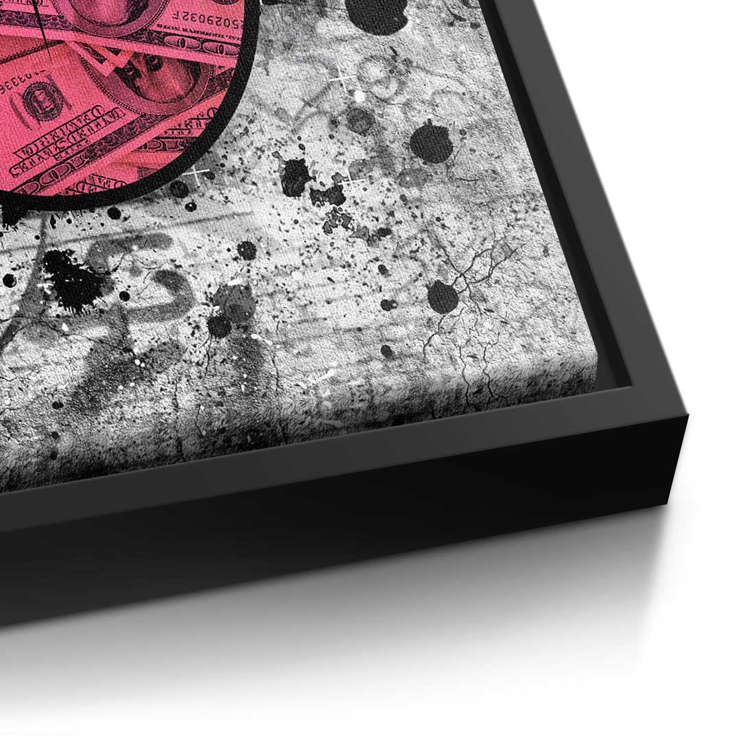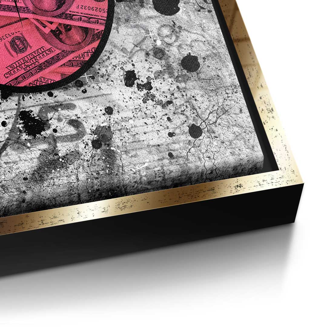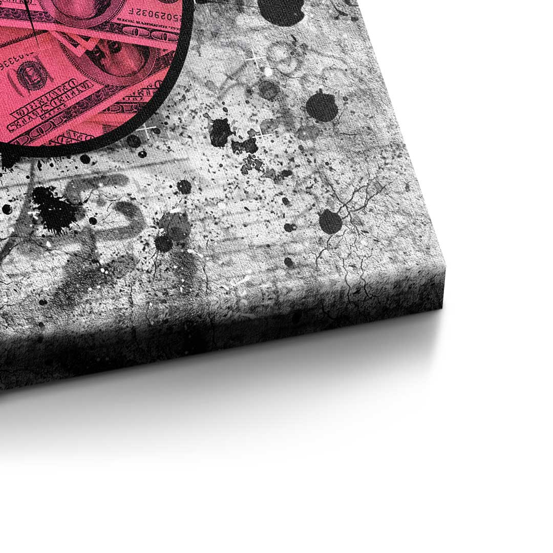 DOTCOMCANVAS® Premium Leinwandbild im Pop Art Stil : Mund mit Zunge aus Dollarscheinen in rot und grau.