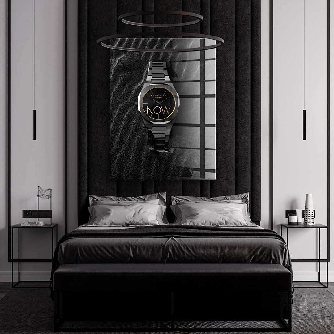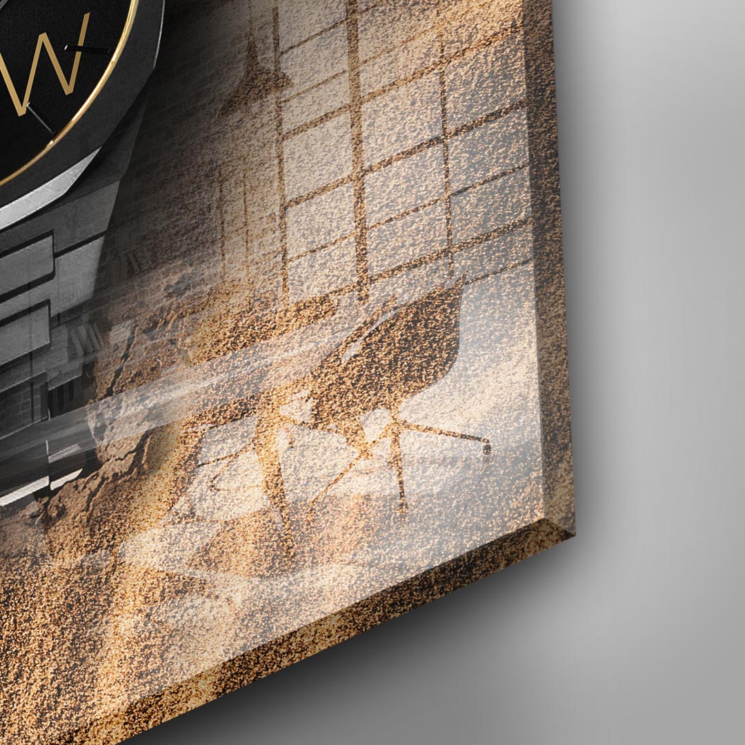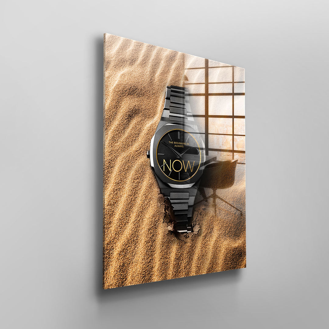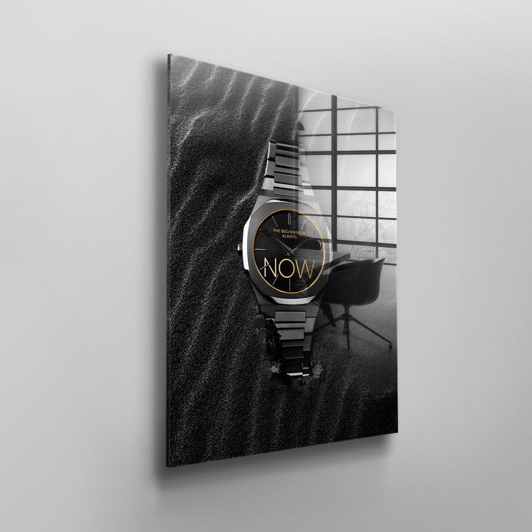 DOTCOMCANVAS® Premium Acrylic Glass Wall Art with Clock Motif and Motivational Quote: The Beginning is always Now.