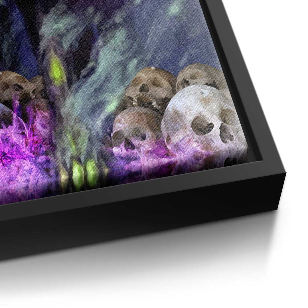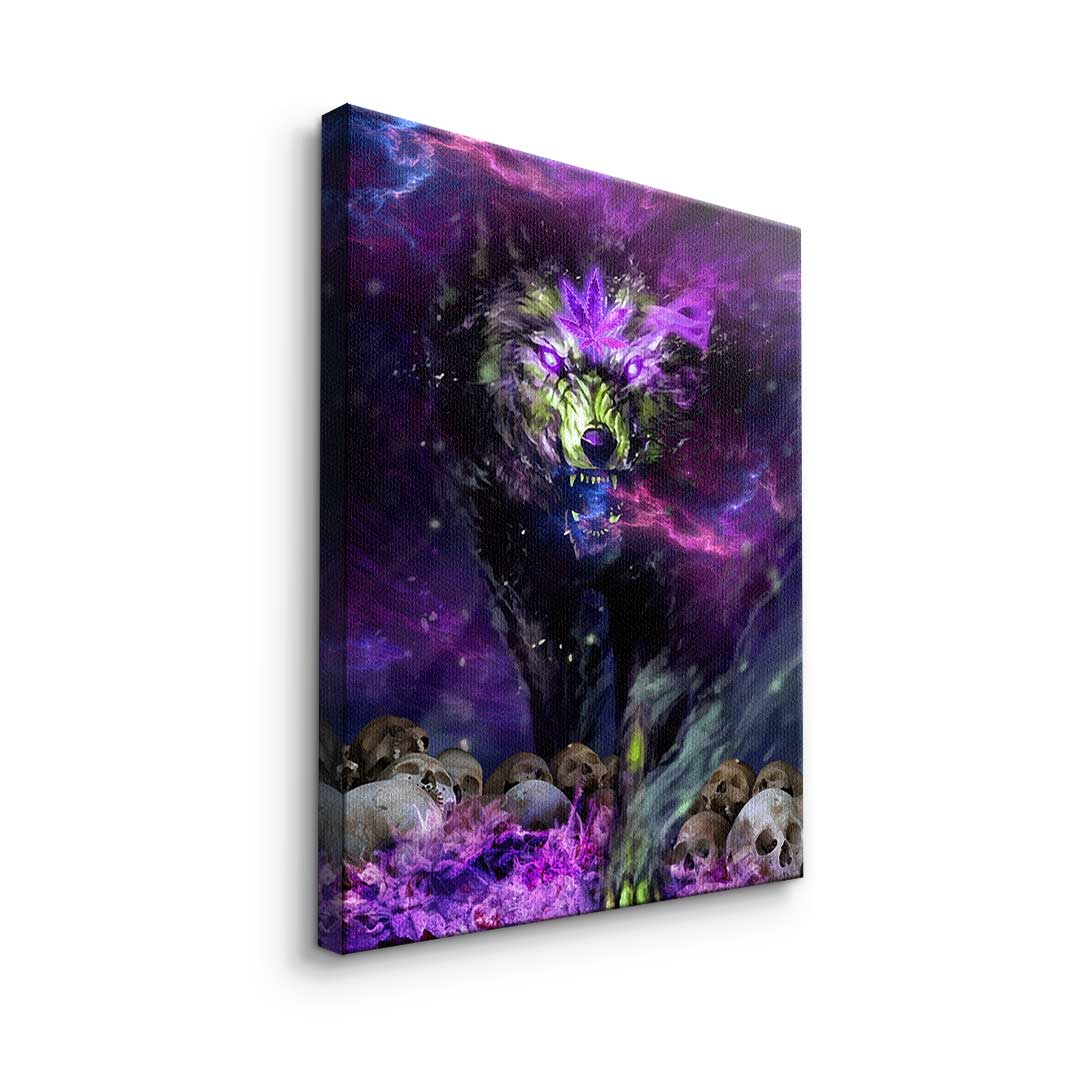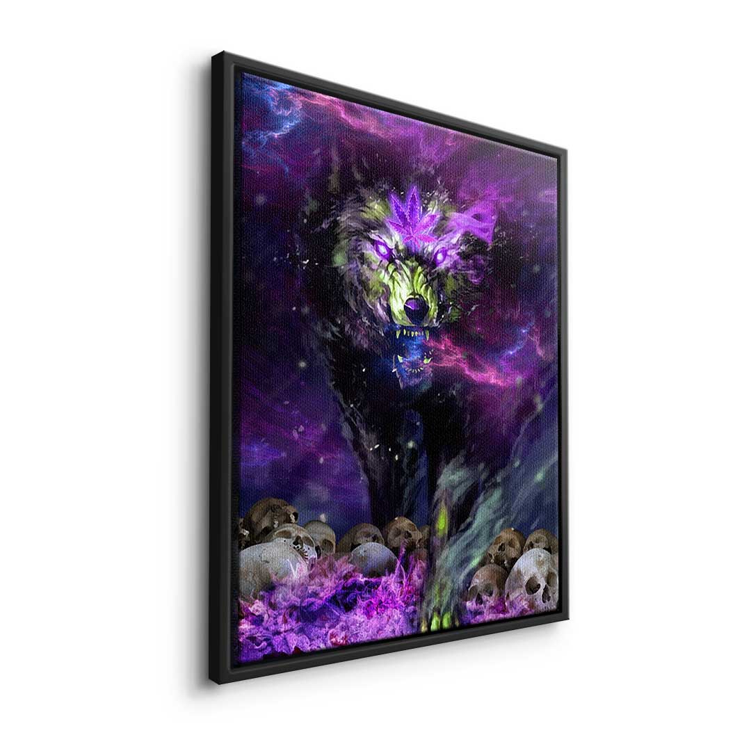DOTCOMCANVAS® Premium canvas print in Pop Art style with wolf and cannabis plant in purple and black.