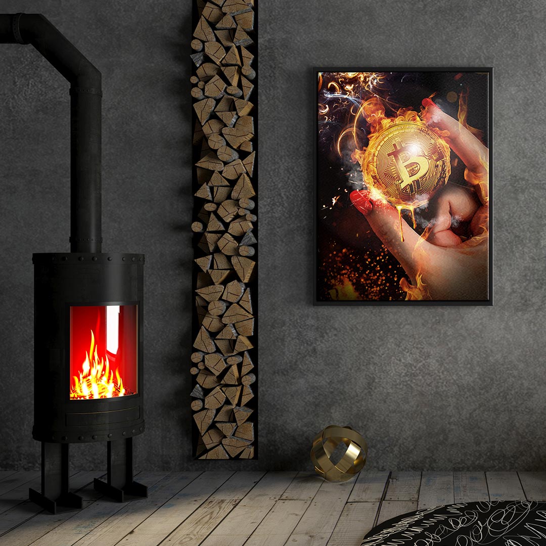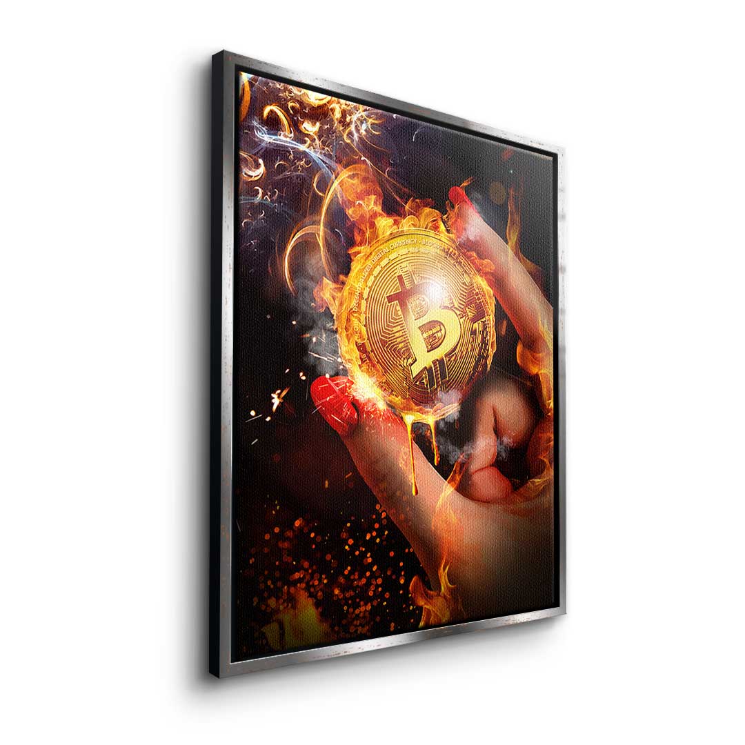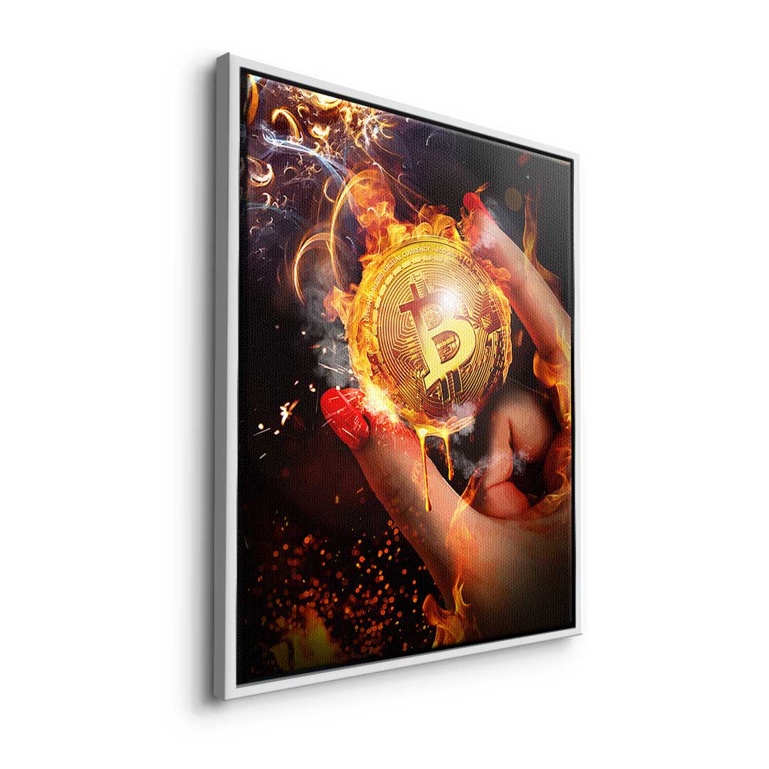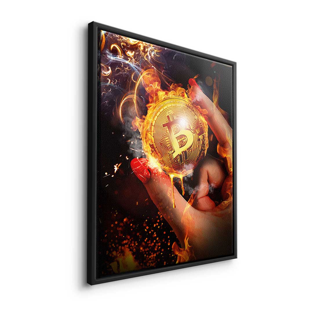 DOTCOMCANVAS® Premium Canvas Print featuring Bitcoin in a hand and a fiery background.