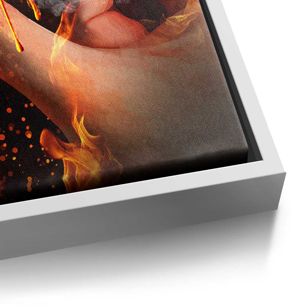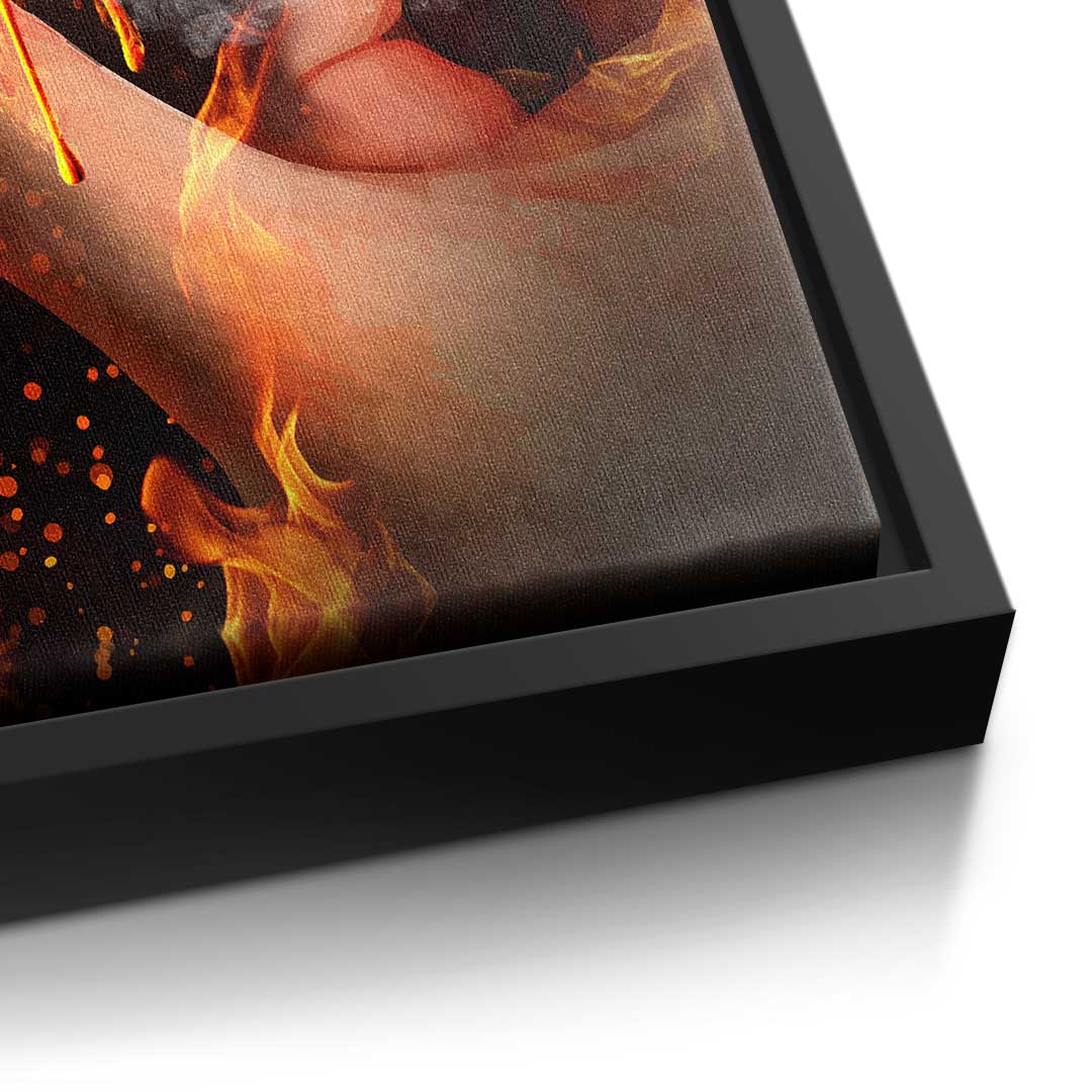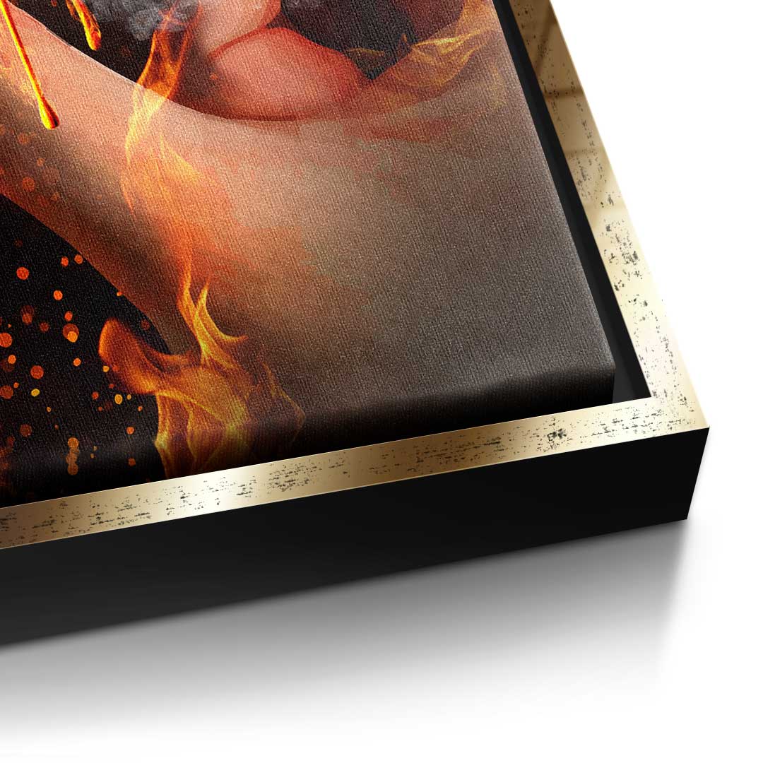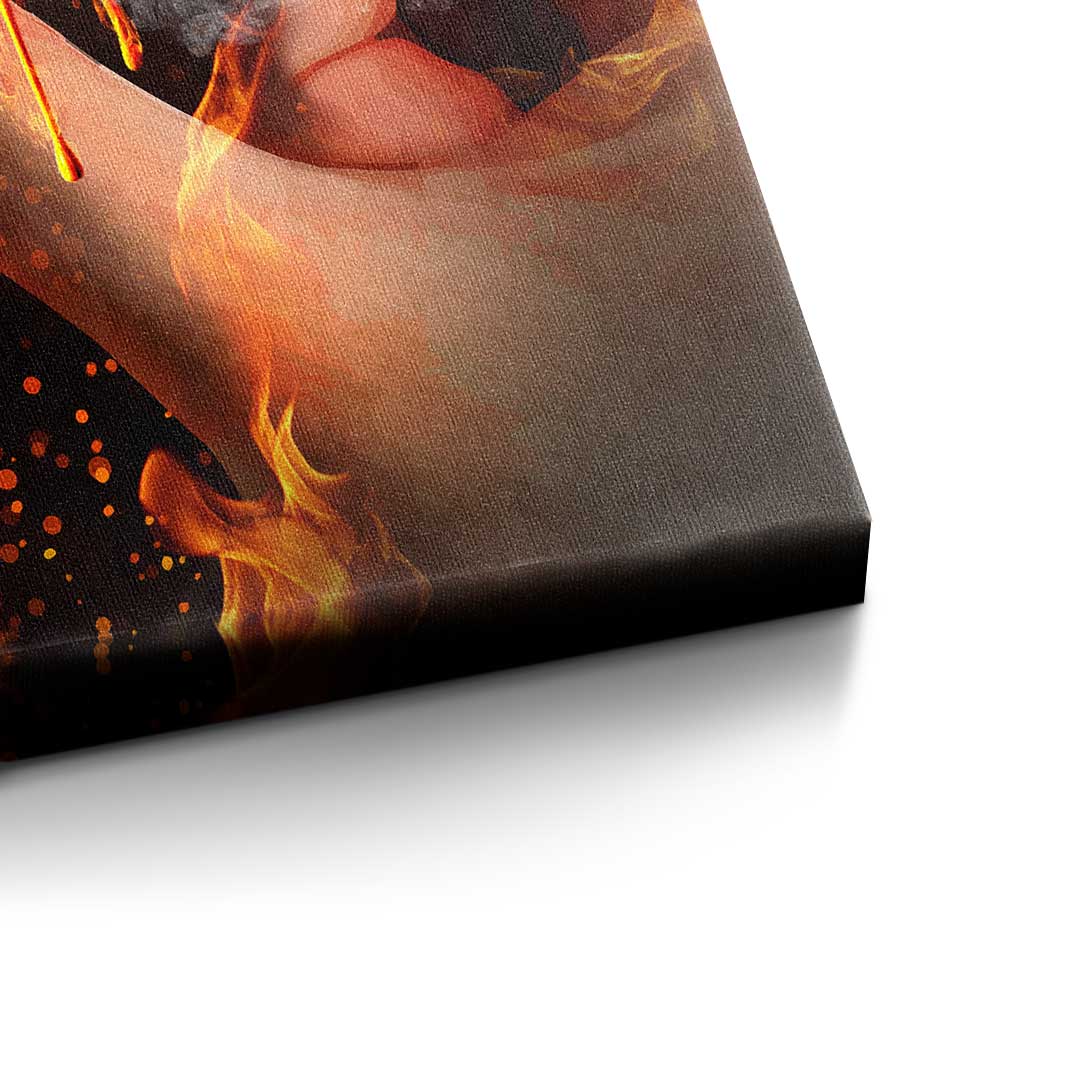 DOTCOMCANVAS® Premium Canvas Print featuring Bitcoin in a hand and a fiery background.