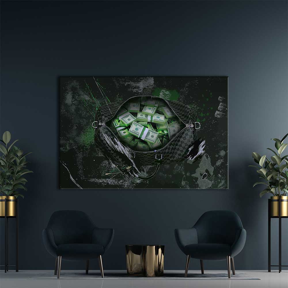 DOTCOMCANVAS® Premium Canvas Print with Pop Art Motif: Green bundles of money in a bag.