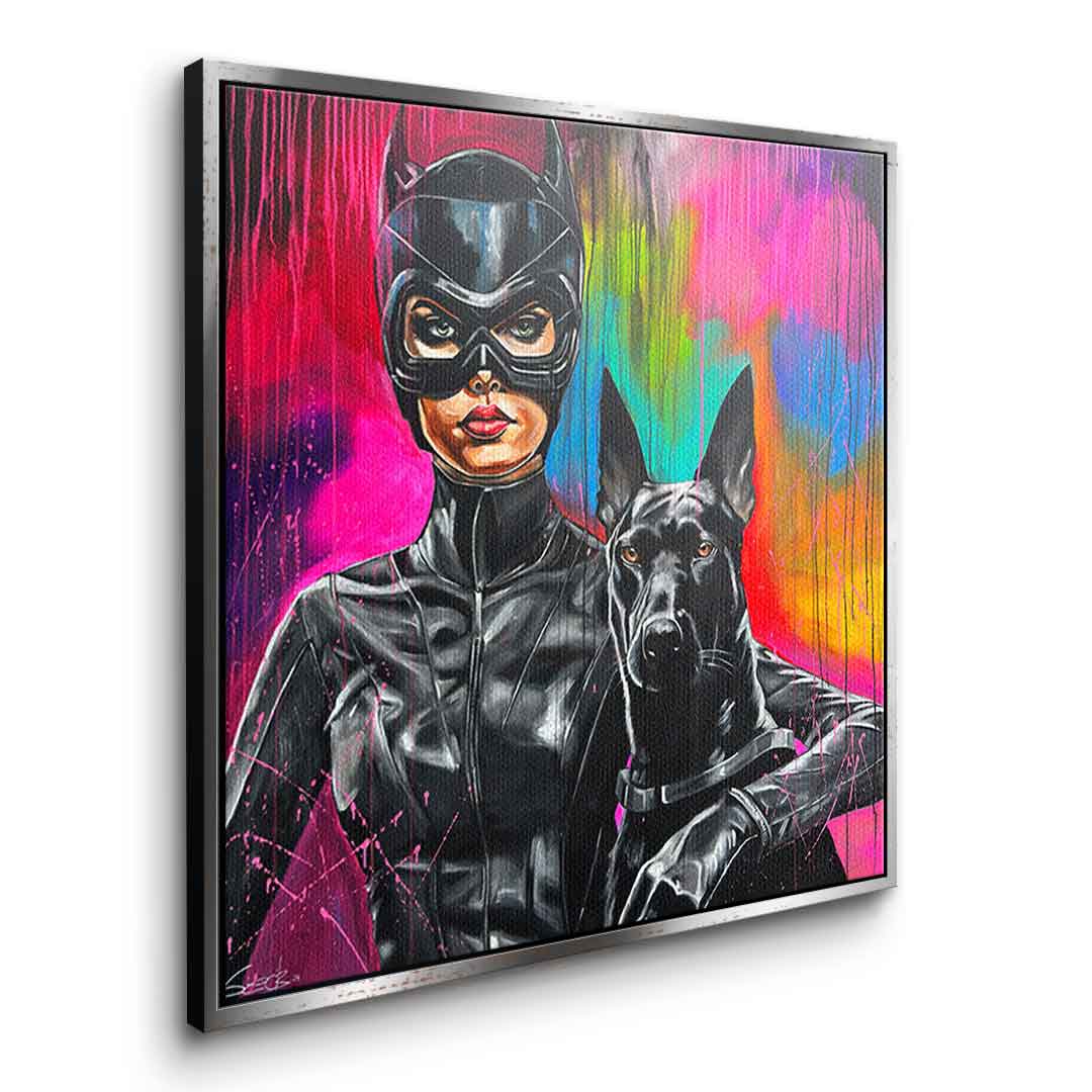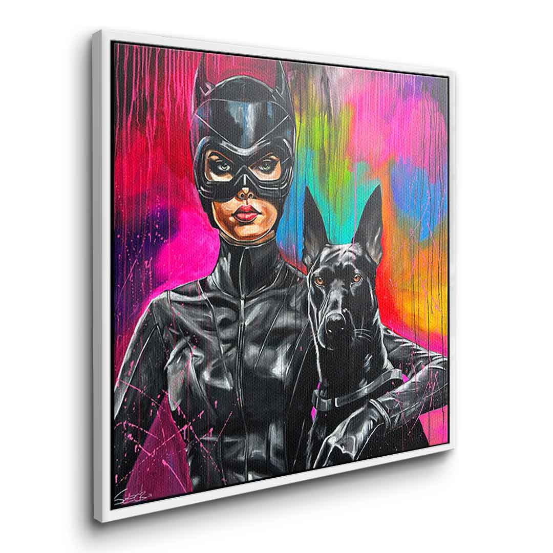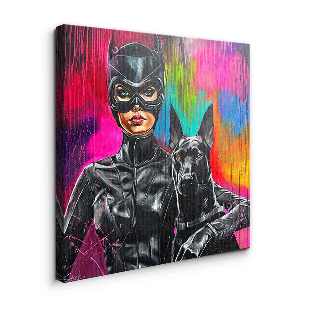 DOTCOMCANVAS® Premium Leinwandbild mit Catwoman und Dobermann Motiv im Gemälde - Stil.