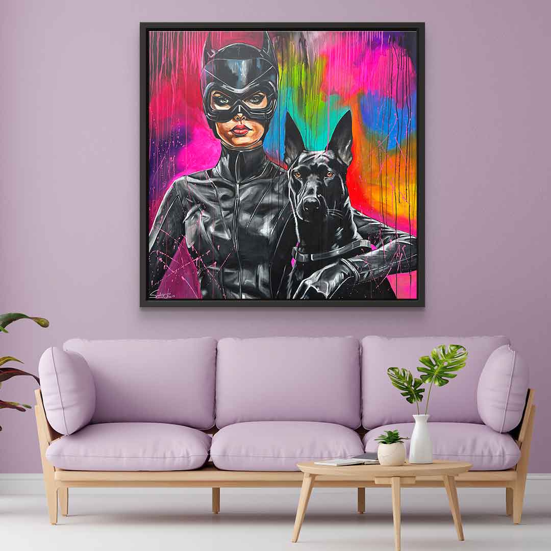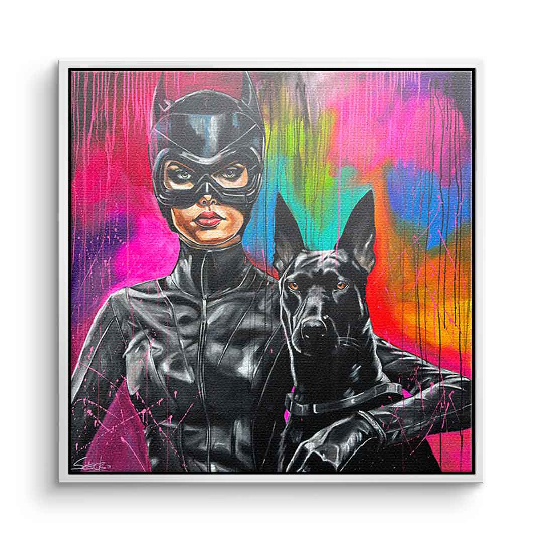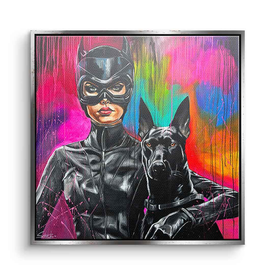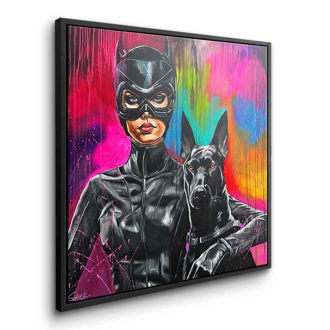 DOTCOMCANVAS® Premium Leinwandbild mit Catwoman und Dobermann Motiv im Gemälde - Stil.