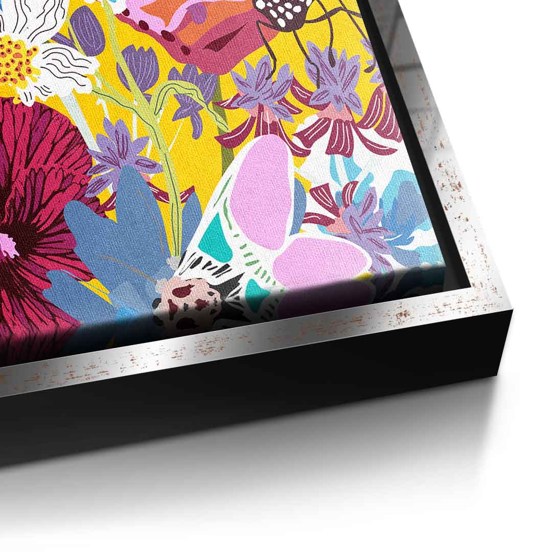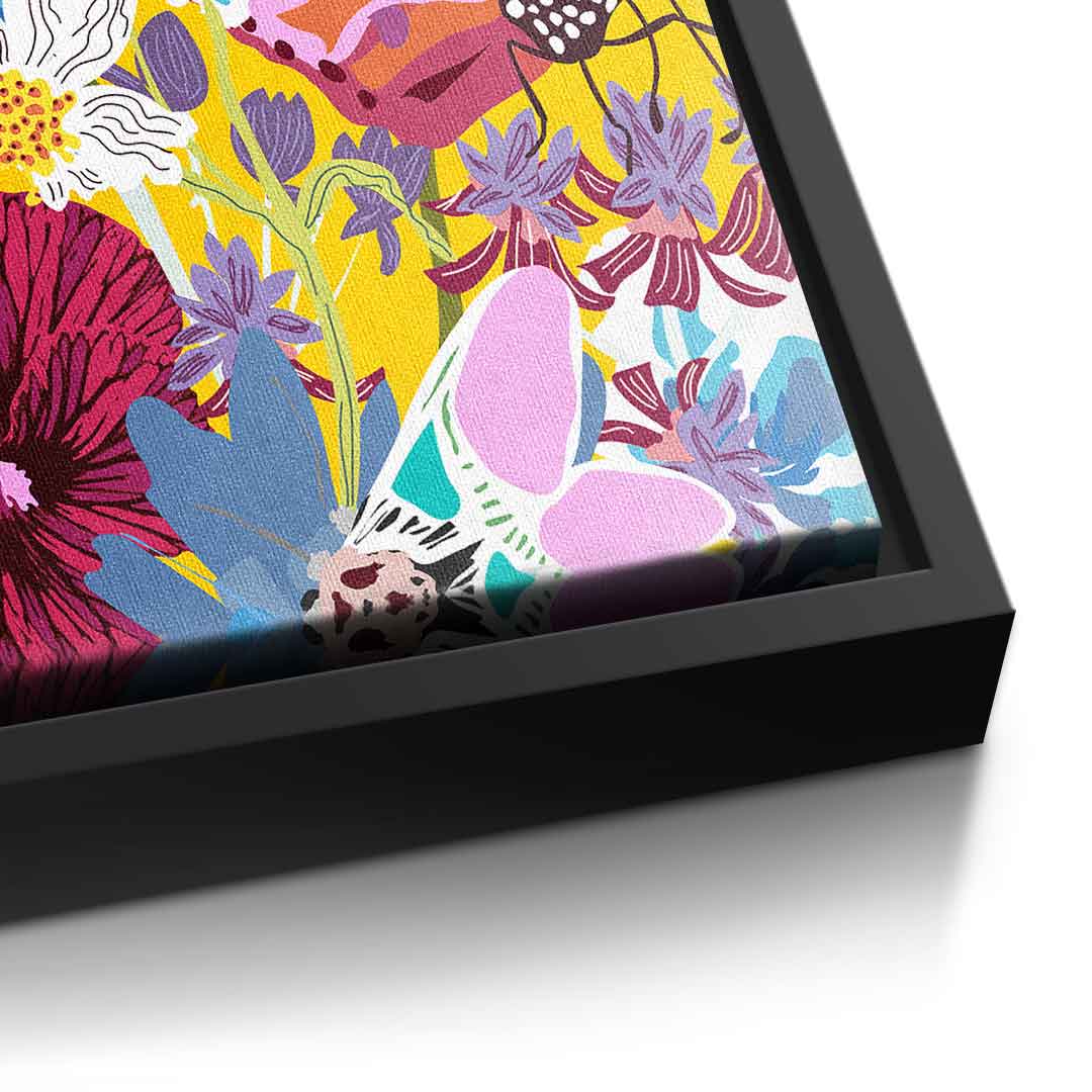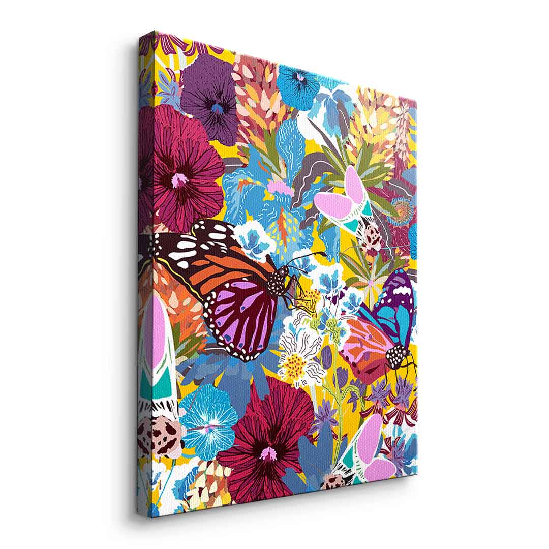 DOTCOMCANVAS® Premium Leinwandbild mit farbenfrohen Blumen und Schmetterling - Motiv.