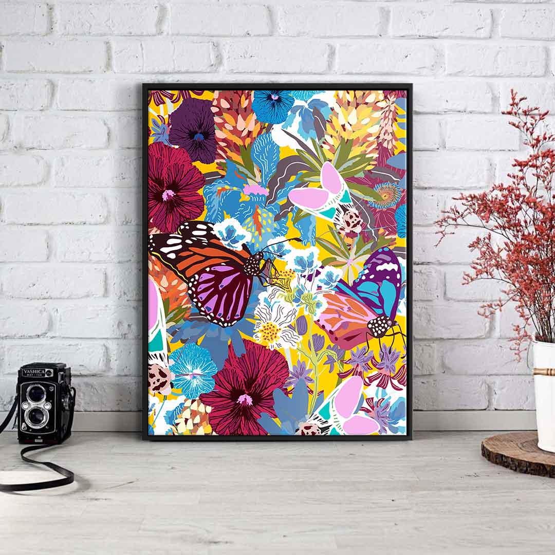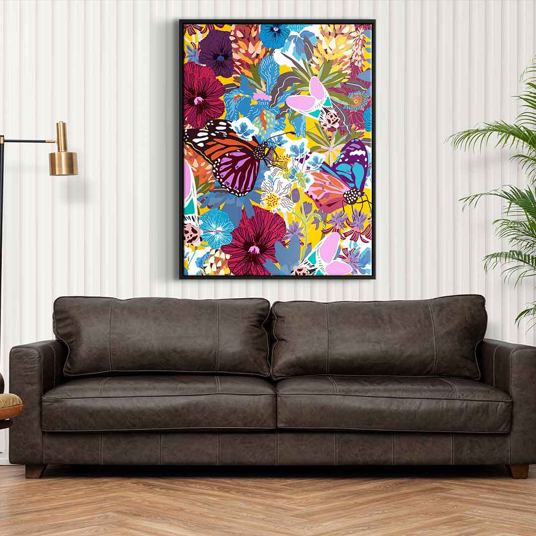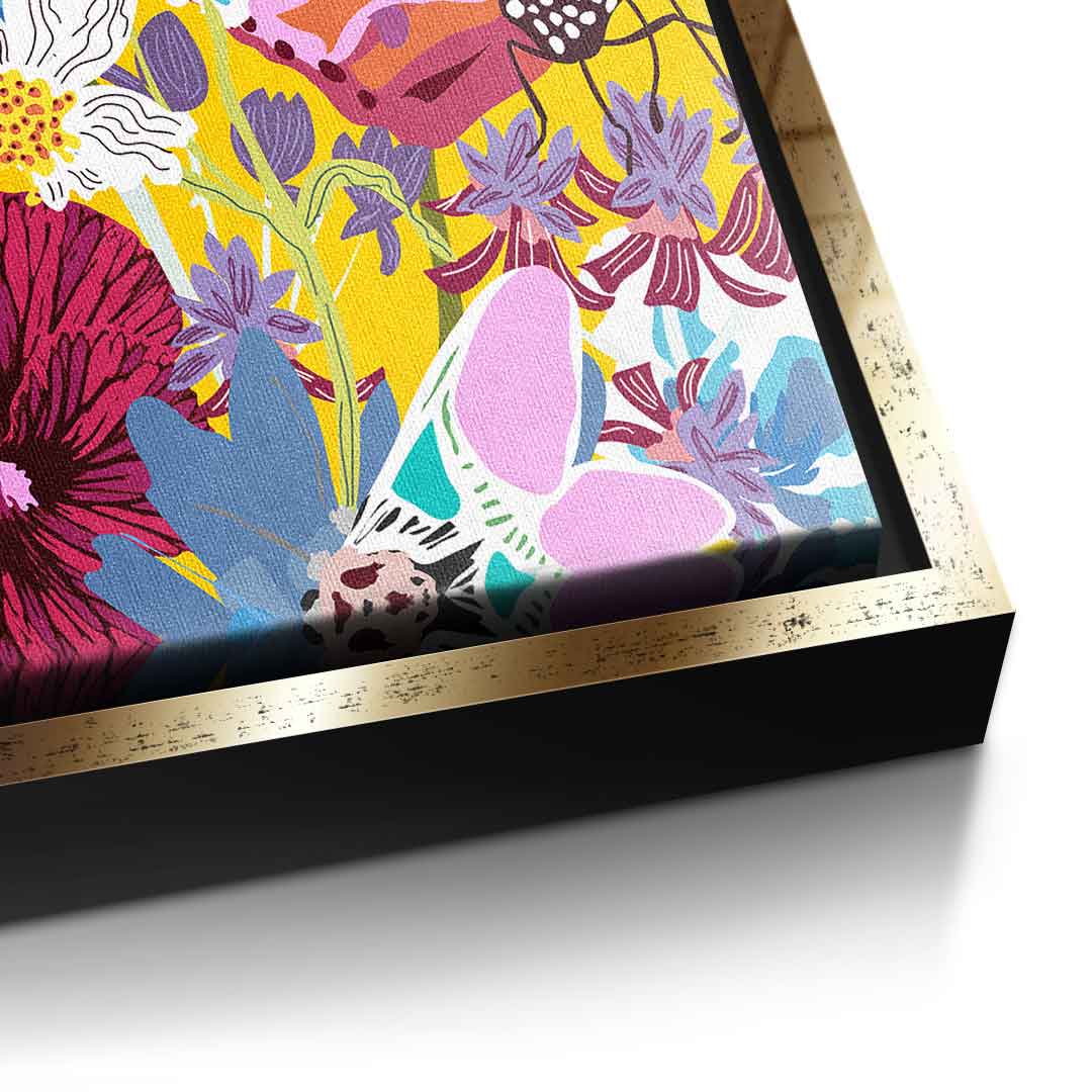 DOTCOMCANVAS® Premium Leinwandbild mit farbenfrohen Blumen und Schmetterling - Motiv.