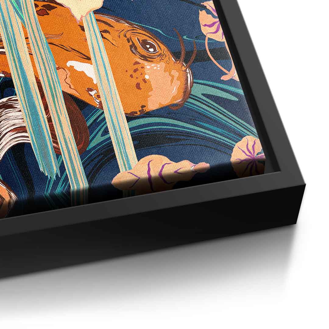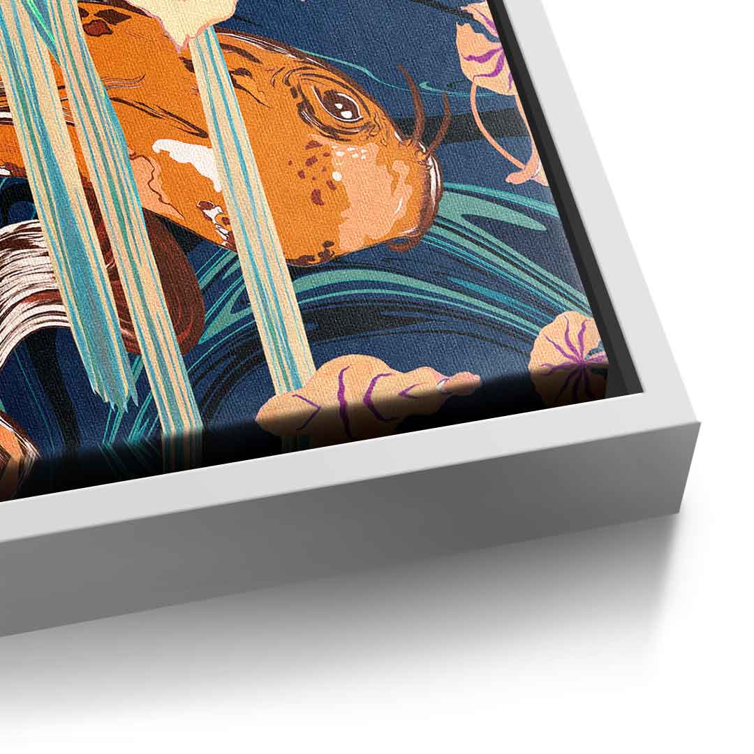 DOTCOMCANVAS® Premium Leinwandbild mit abstraktem Koi Fische und Blumen Motiv.