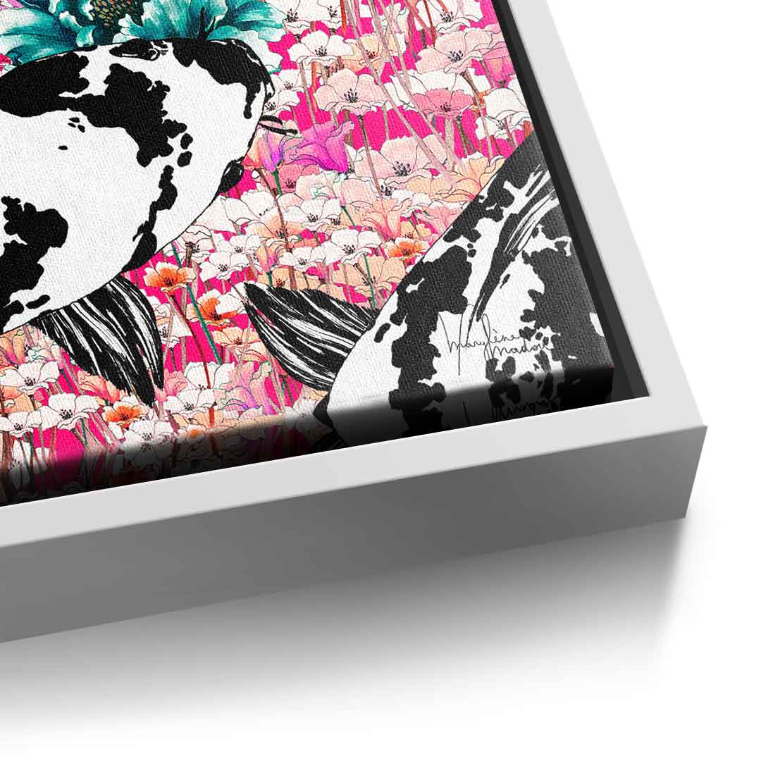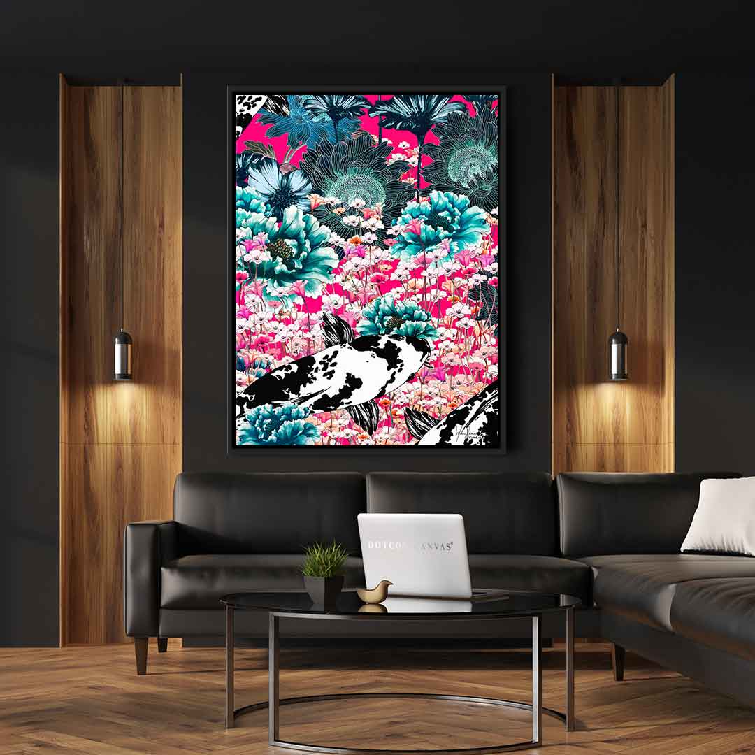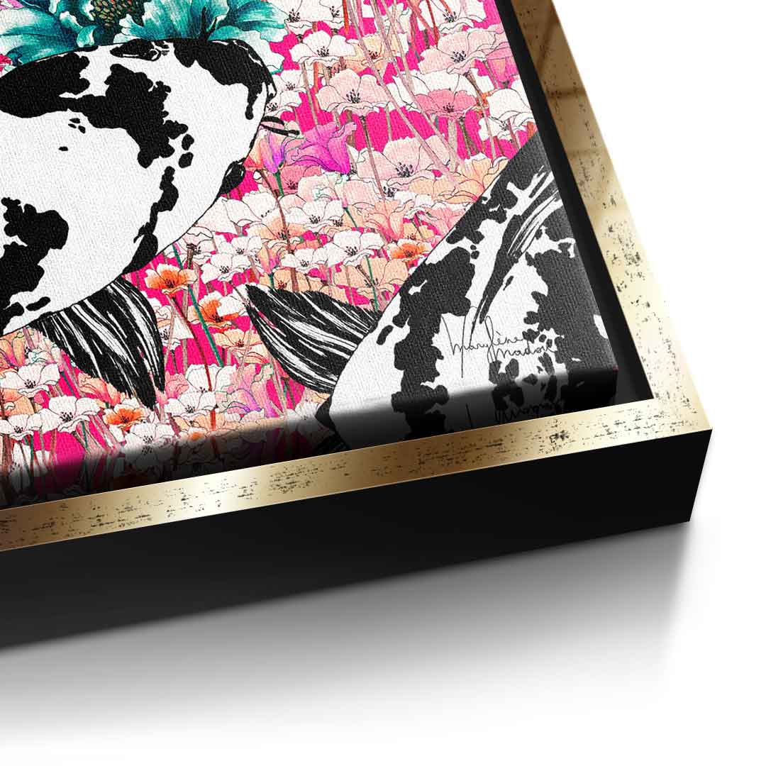 DOTCOMCANVAS® Premium Leinwandbild mit abstraktem Koi Fische und Blumen Motiv.