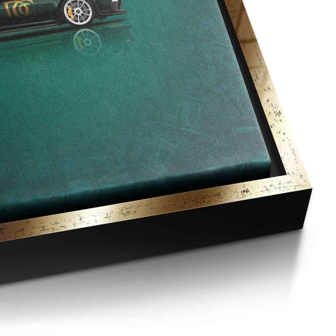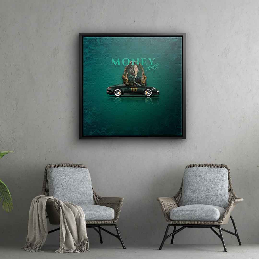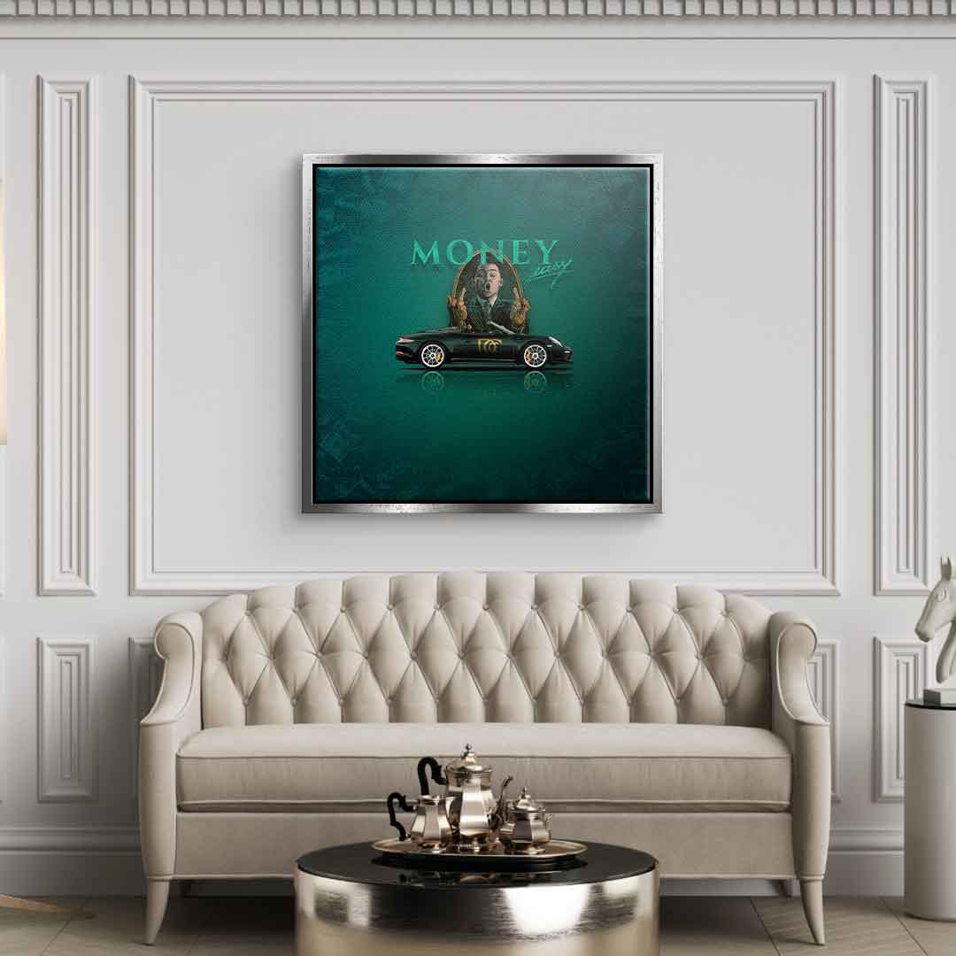 DOTCOMCANVAS® Premium Canvas Print with Green Sports Car and "Money easy" Lettering - Motif.