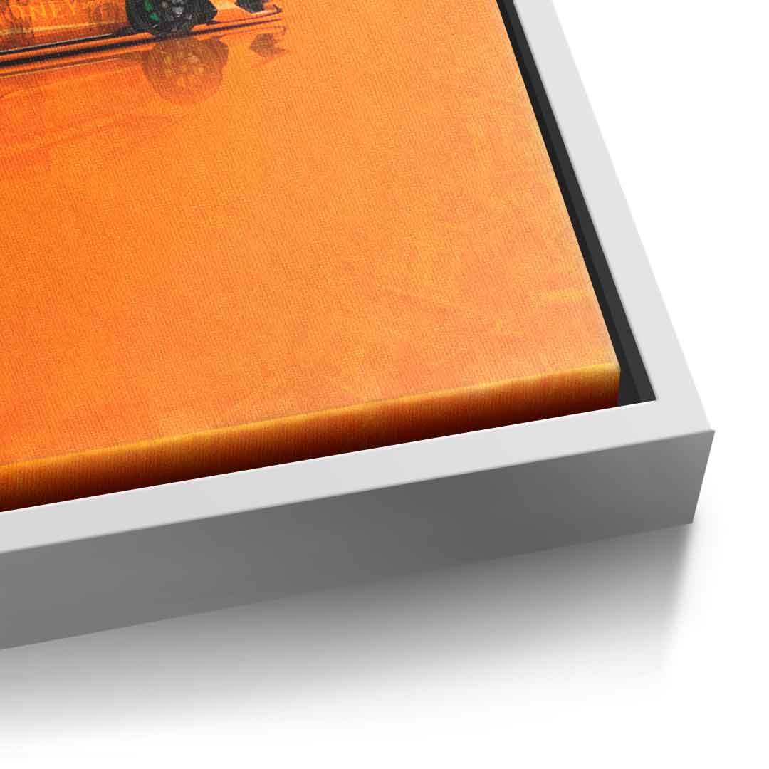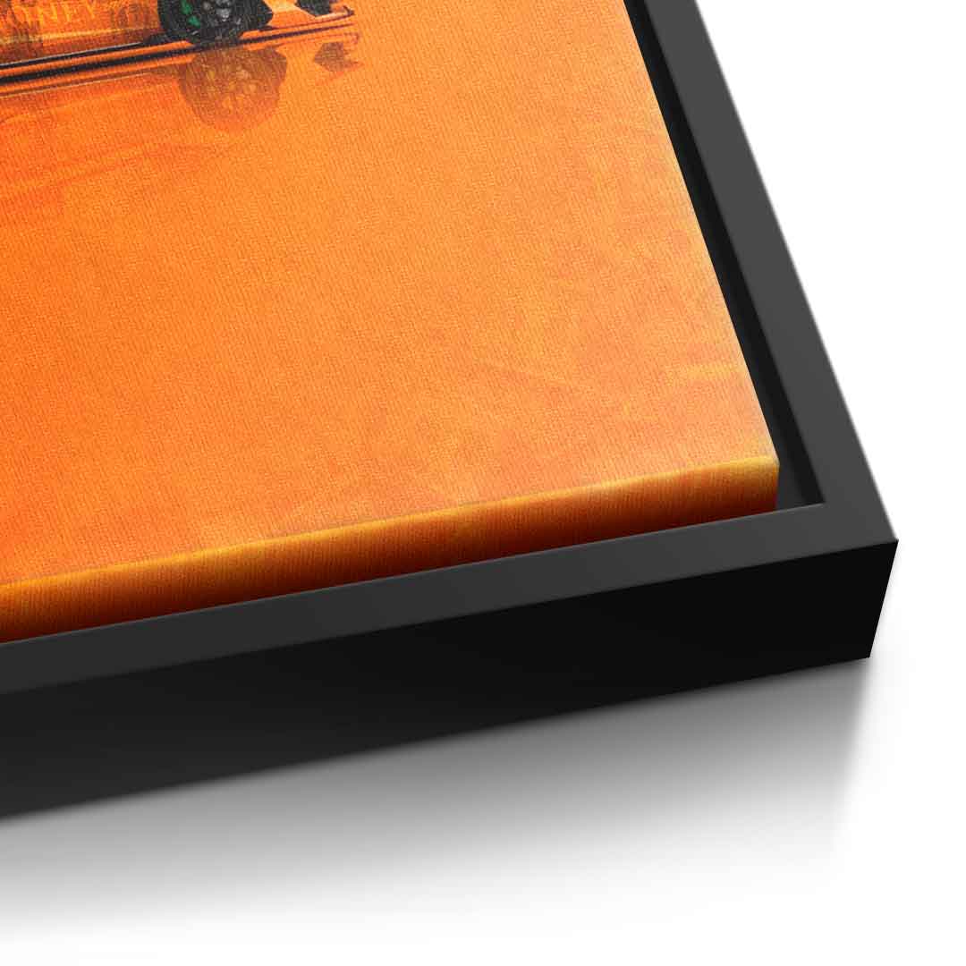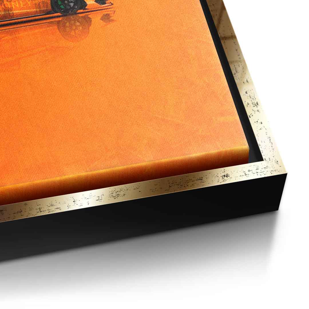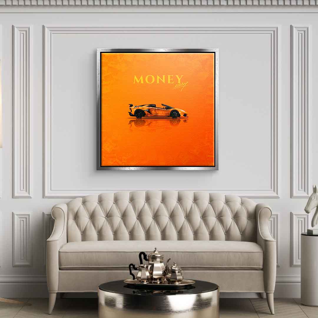 DOTCOMCANVAS® Premium Leinwandbild mit gelben/orangenem Lamborghini Aventador und Schriftzug Money easy - Motiv.