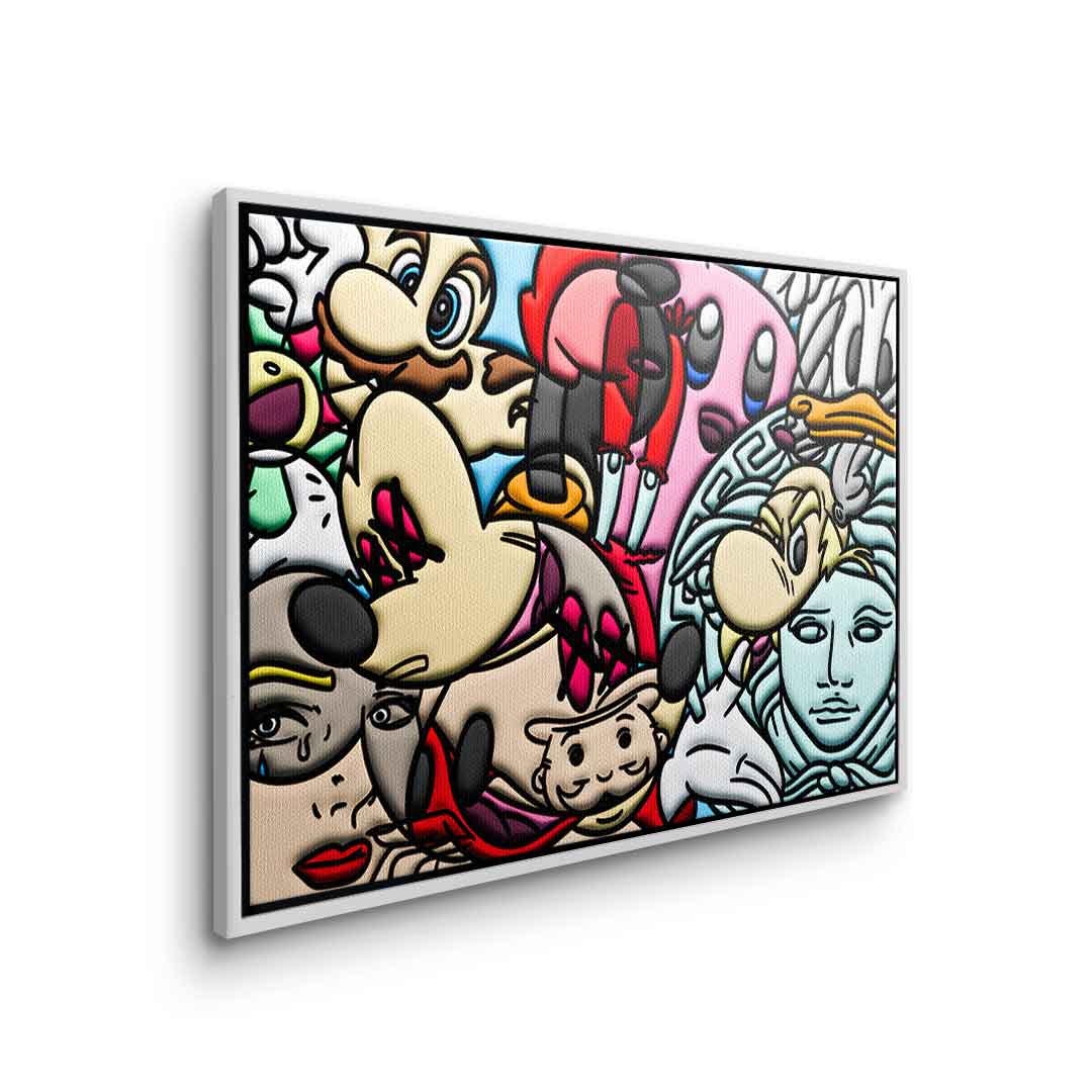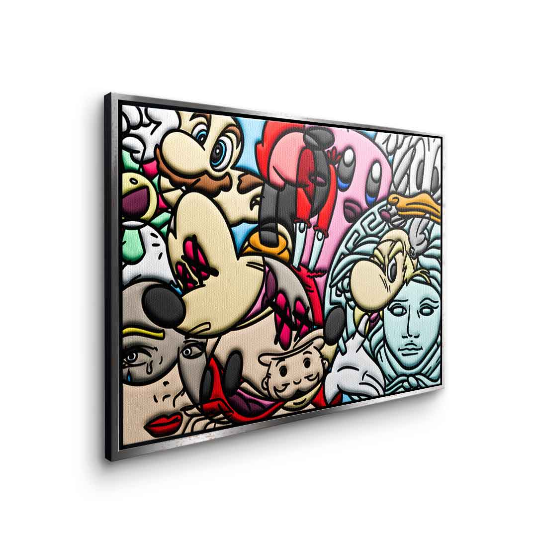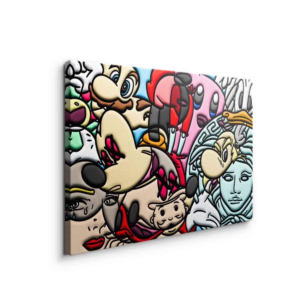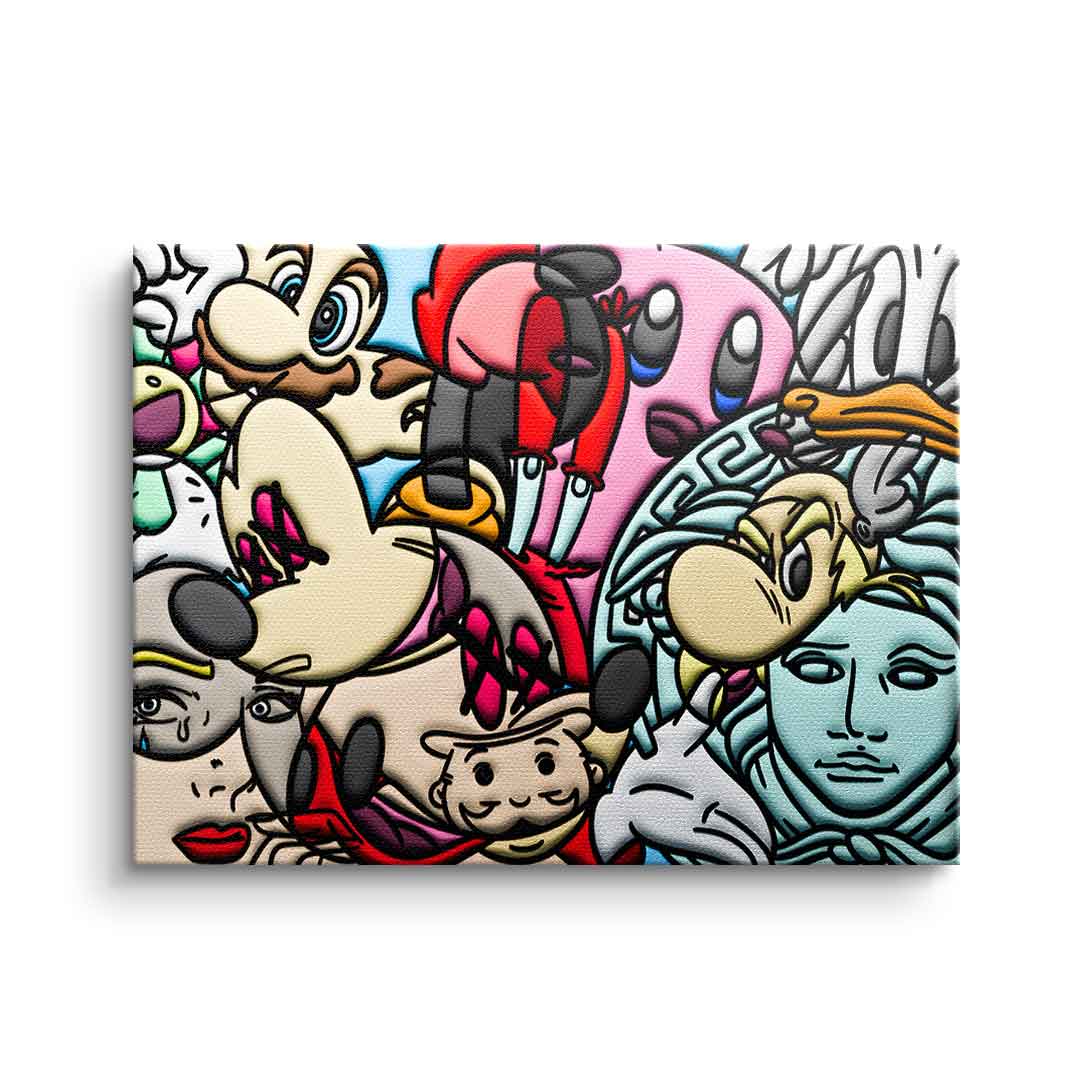 DOTCOMCANVAS® Premium Leinwandbild mit einer Collage verschiedener Comic Figuren als Motiv.