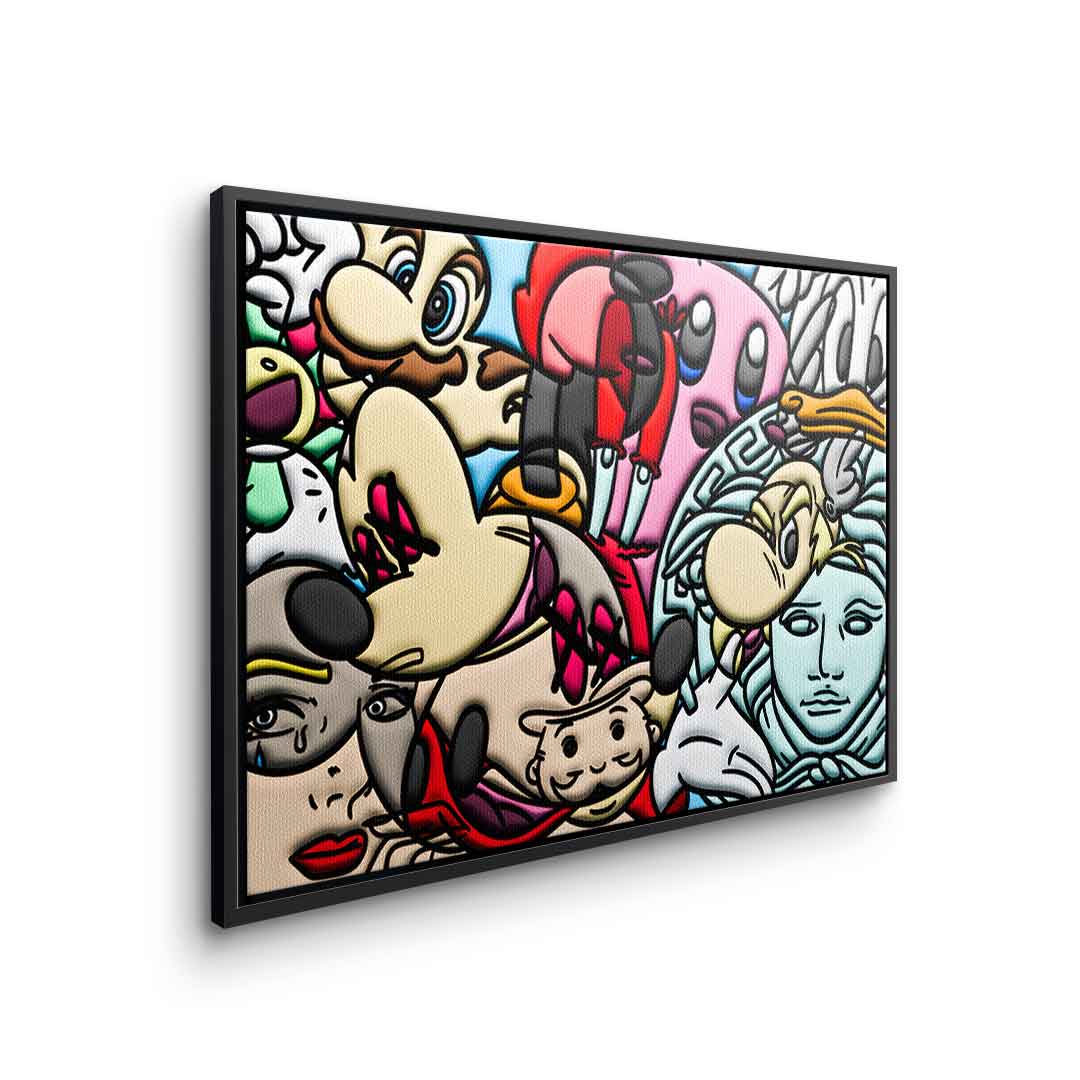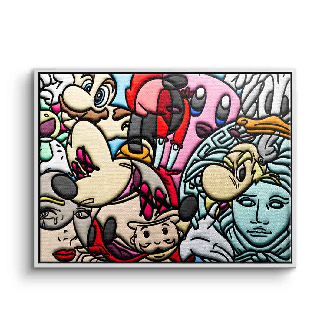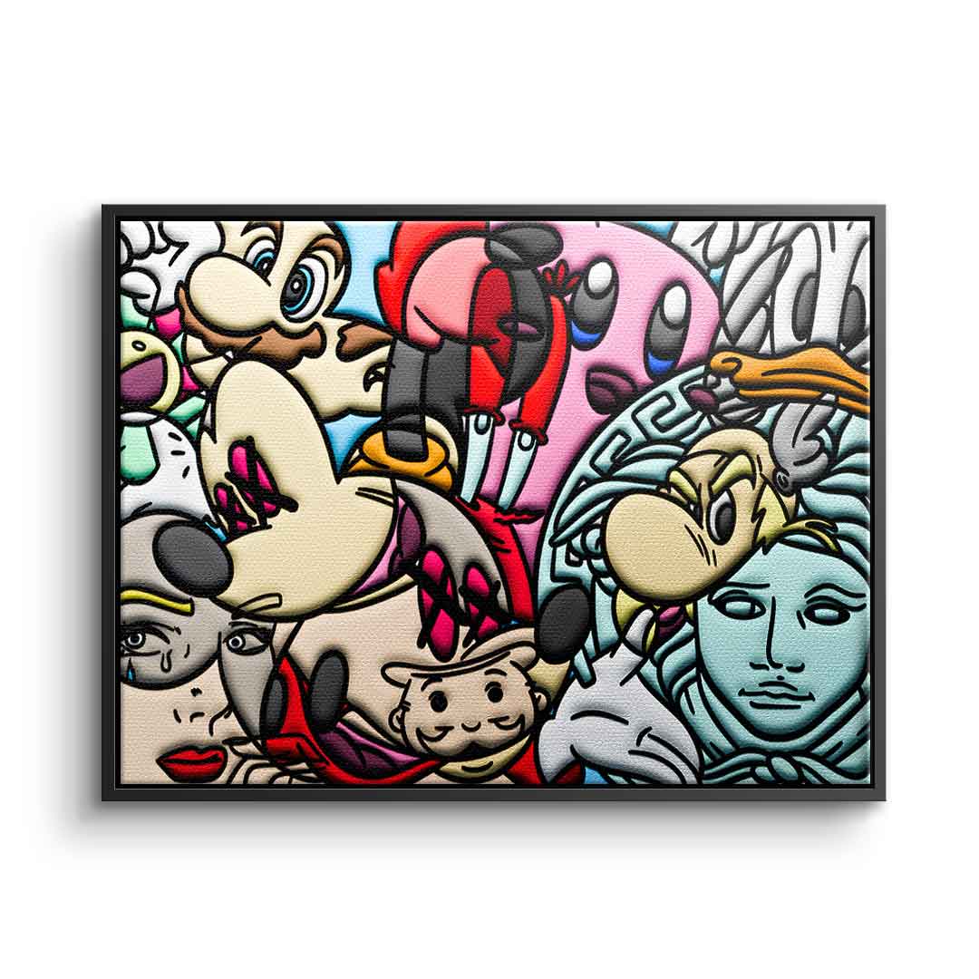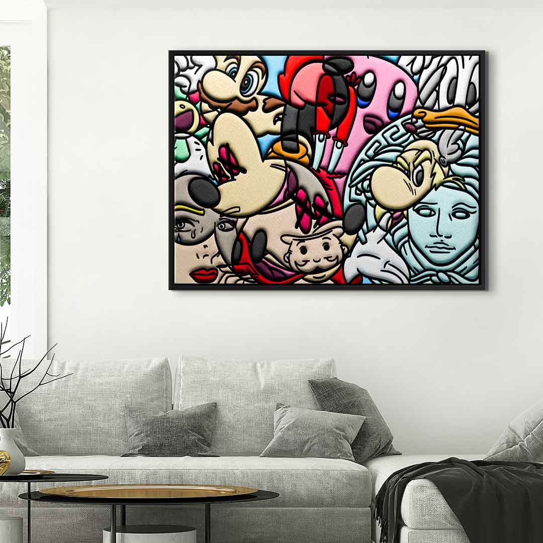 DOTCOMCANVAS® Premium Leinwandbild mit einer Collage verschiedener Comic Figuren als Motiv.