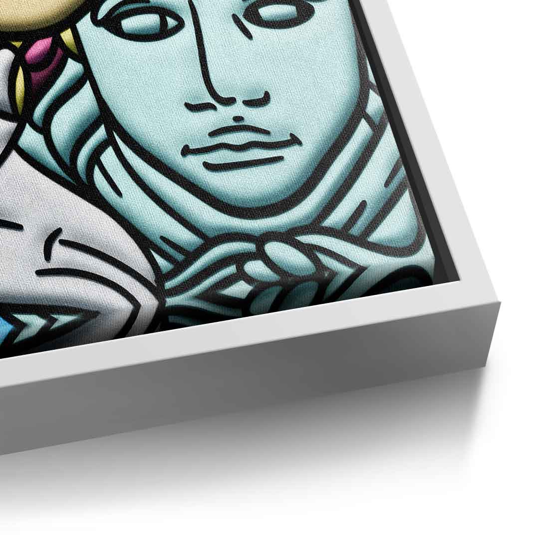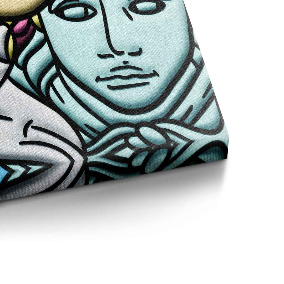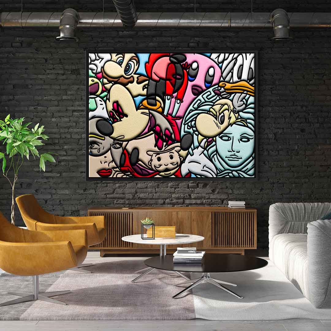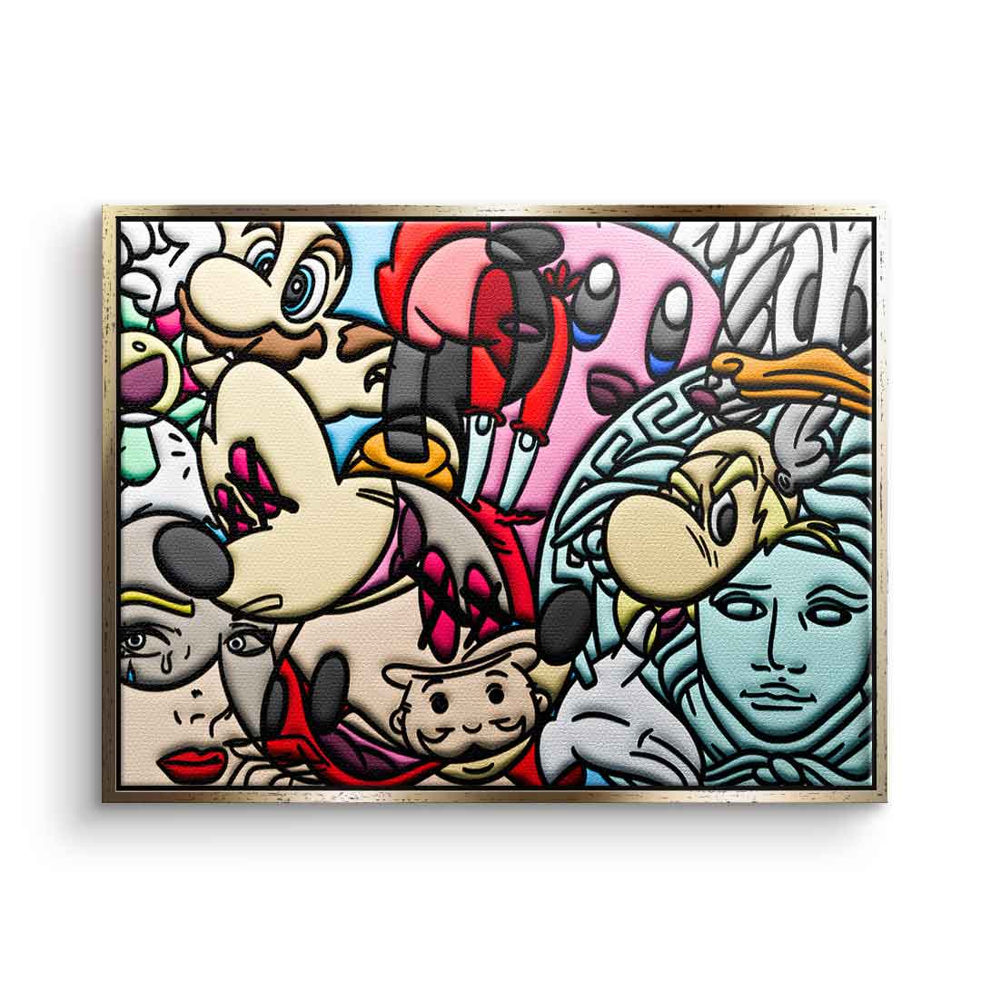 DOTCOMCANVAS® Premium Leinwandbild mit einer Collage verschiedener Comic Figuren als Motiv.