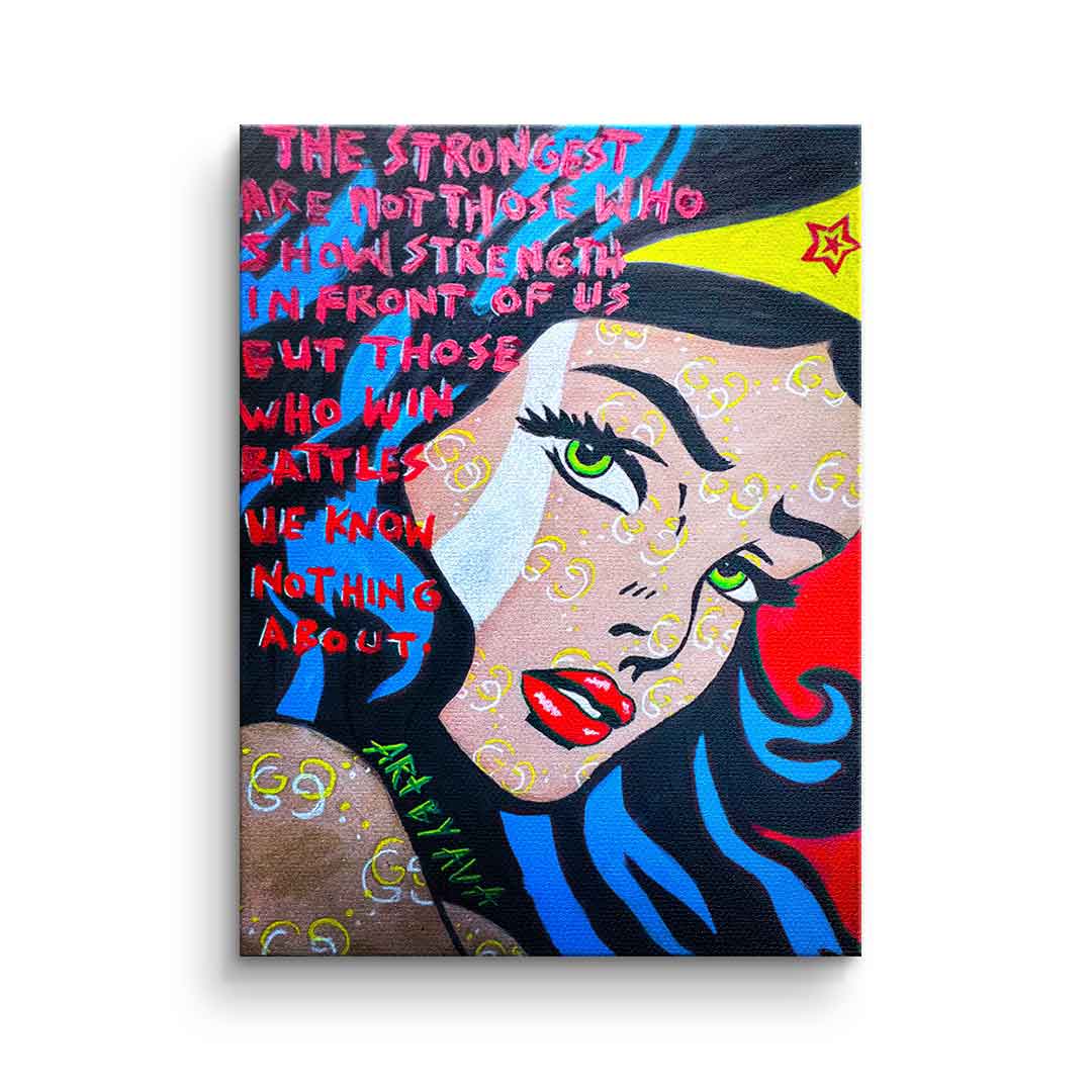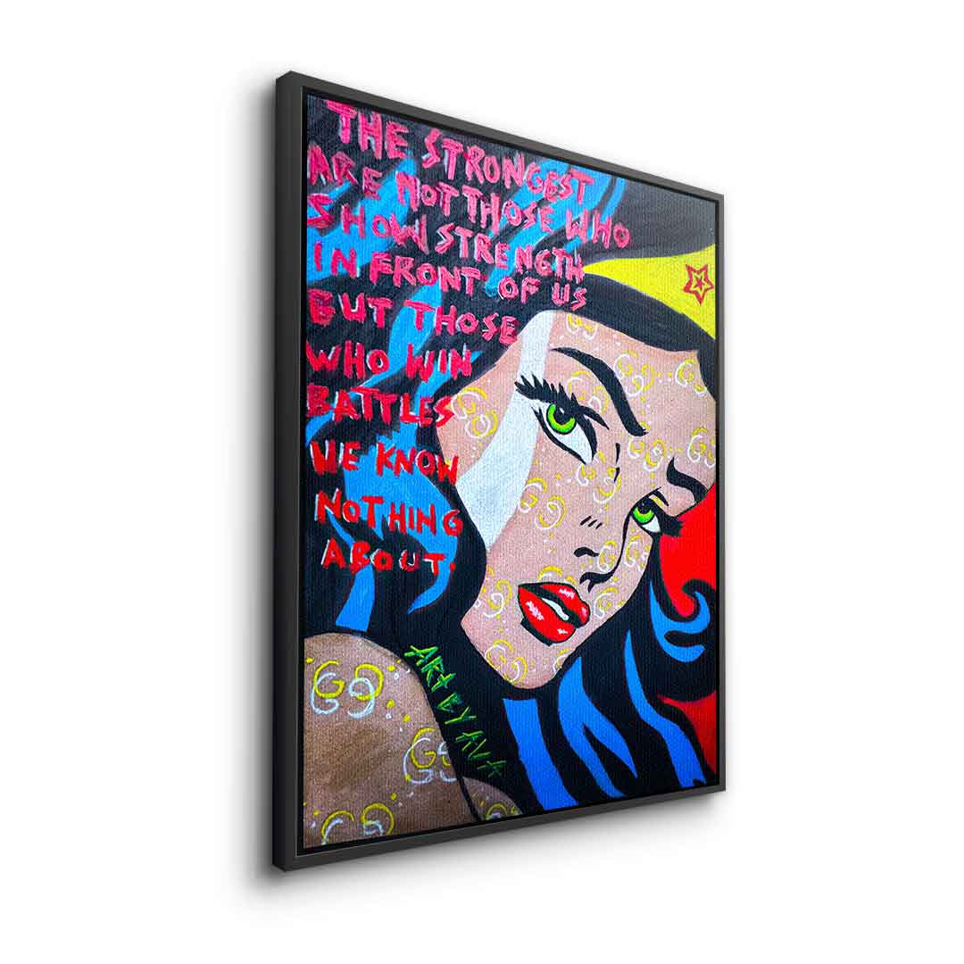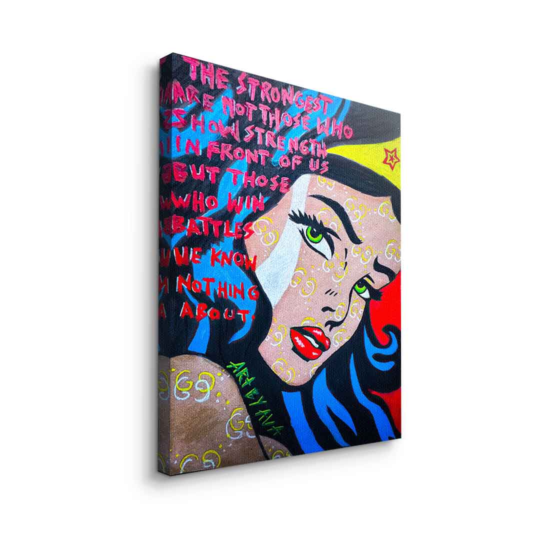 DOTCOMCANVAS® Premium Canvas Print with a motivational Wonder Woman motif in comic/cartoon style.