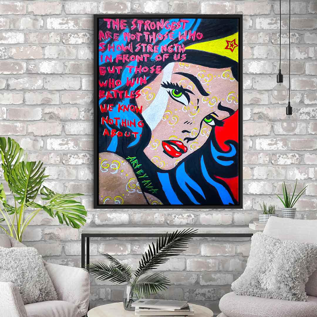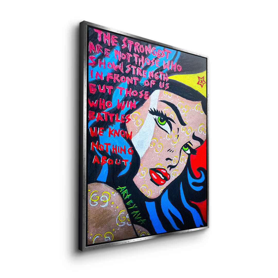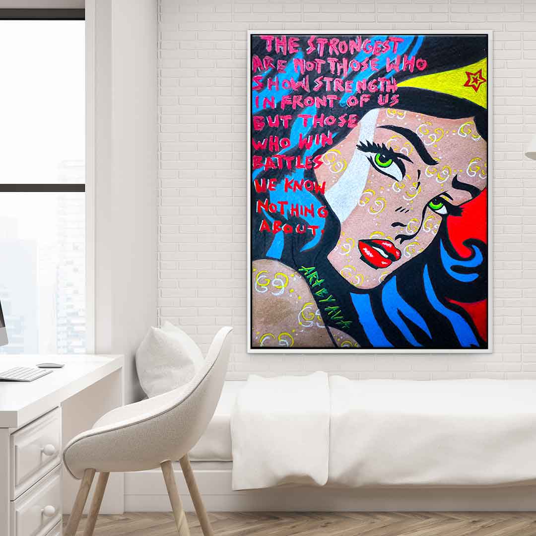 DOTCOMCANVAS® Premium Canvas Print with a motivational Wonder Woman motif in comic/cartoon style.