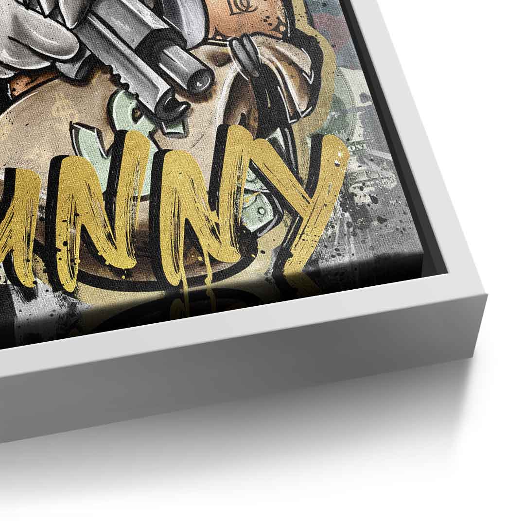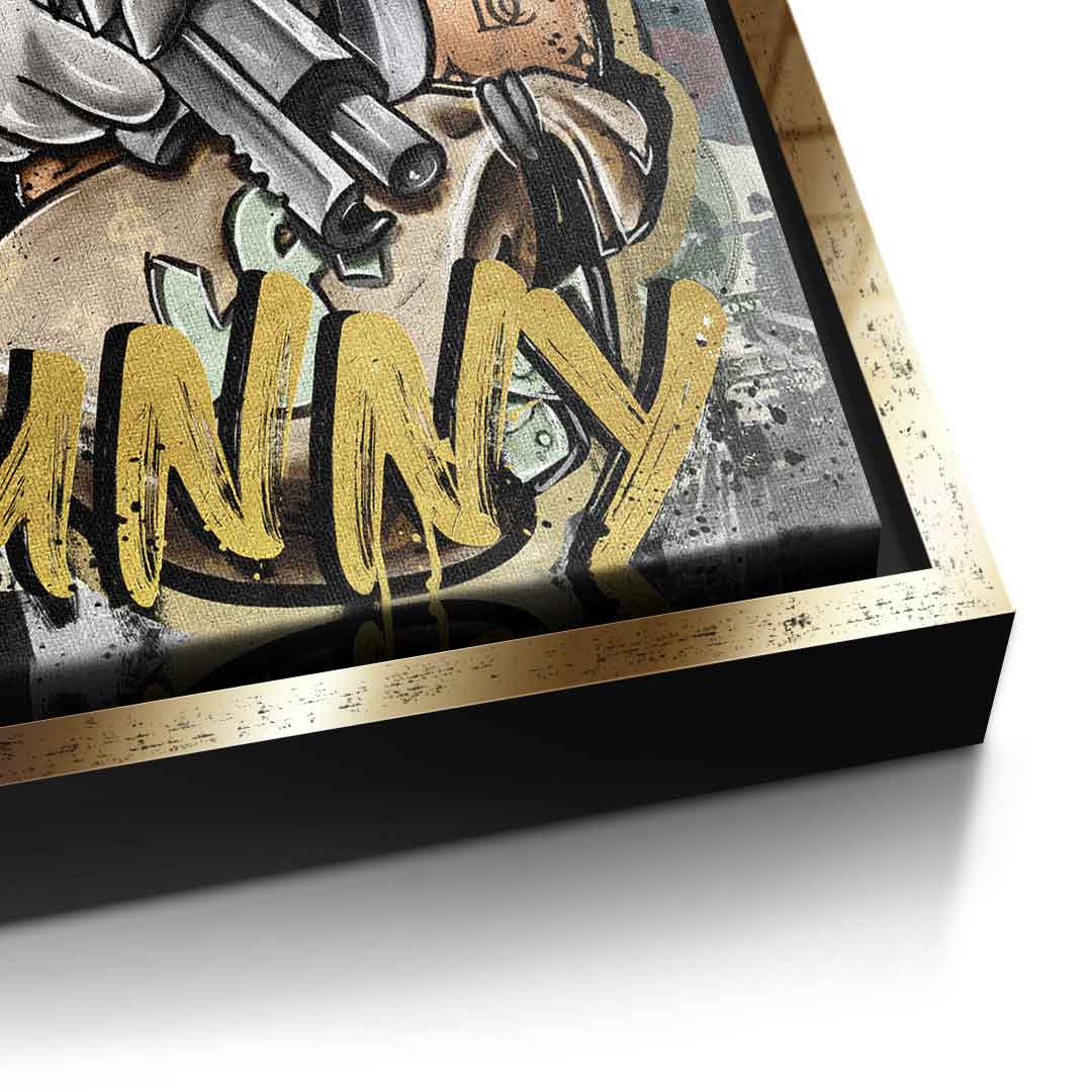 Als Nachfolger zur "Royal Duck." Hier wird im dominanten Stil die Waffe in die Luft gehoben und Macht demonstriert. Das Bild besticht primär durch die Kombination aus Gold und vielen weiteren Farbakzenten. Der Spruch "No Money No Funny" spiegelt die neue Zeit und den Fokus auf die eigenen Ziele wieder. Aufgespannt ist die Premium Leinwand auf eine hochwertigen massiven Keilrahmen - direkt Aufhangbereit.