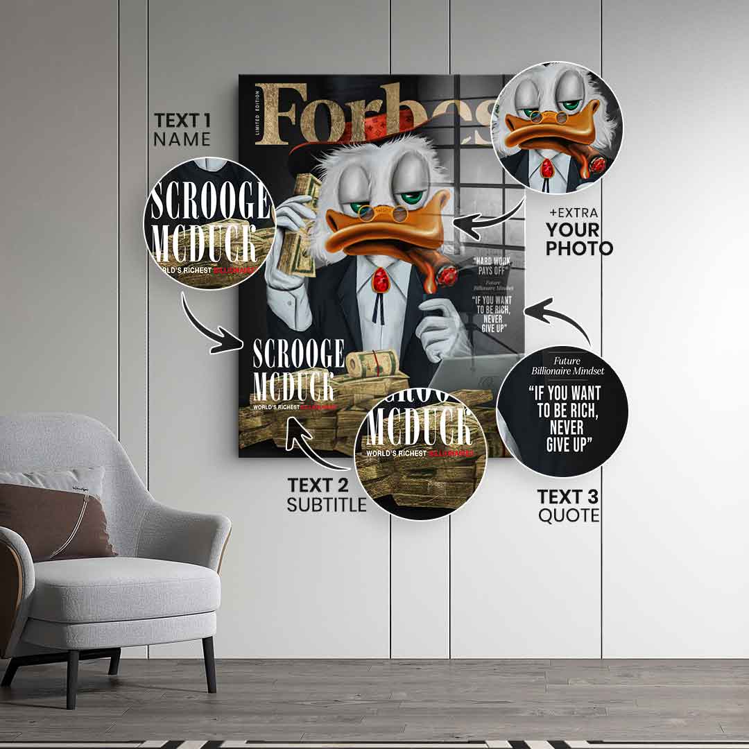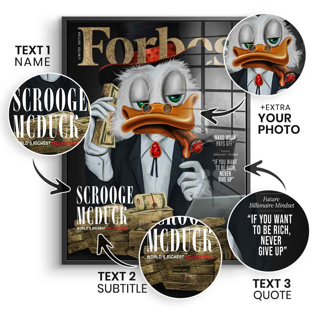 DOTCOMCANVAS® Premium Blattgold mit personalisierbarem Bestseller Motiv mit welchen du deinen Namen auf das Wandbild "Billionaire Duck" bringen kannst.