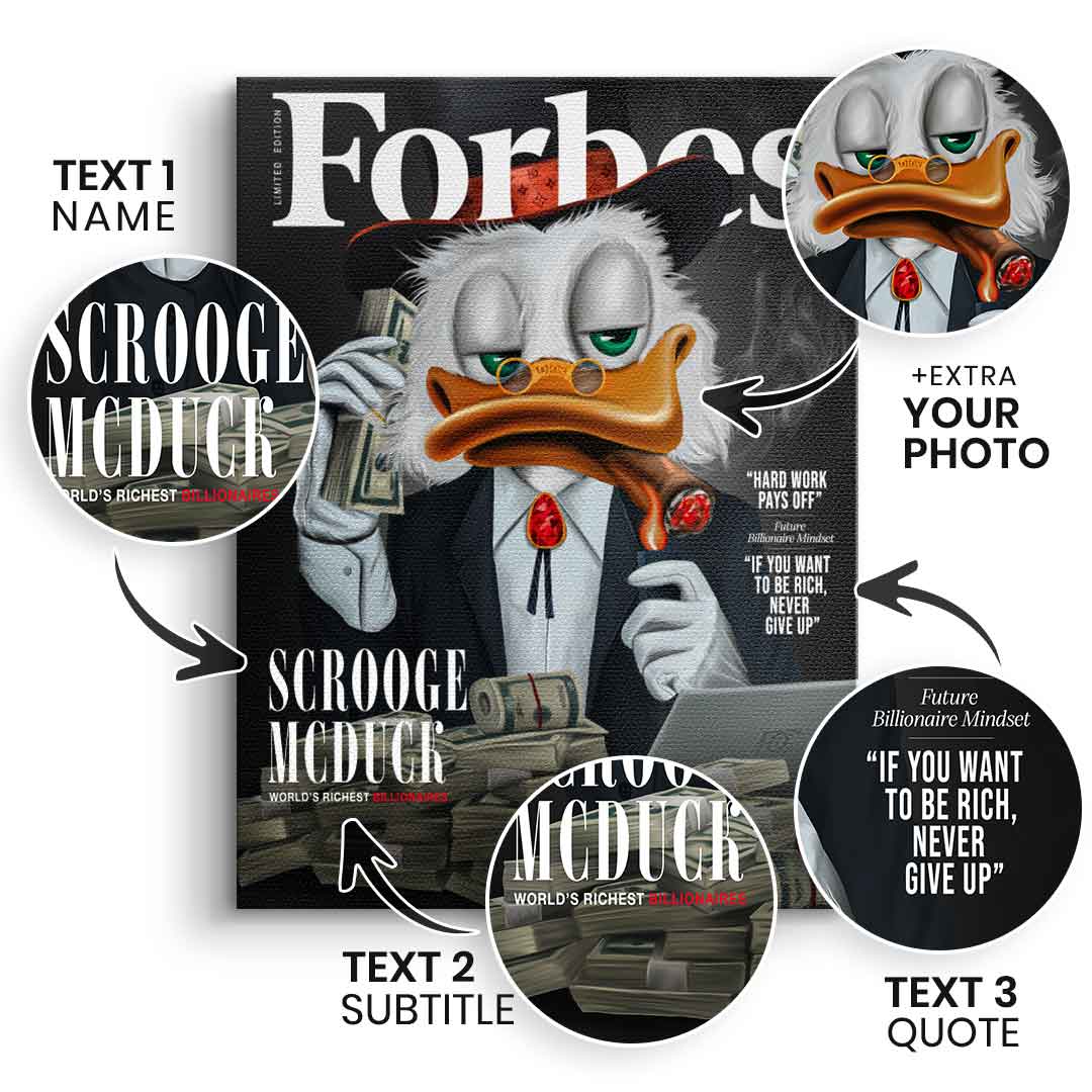 DOTCOMCANVAS® Premium Leinwandbild mit personalisierbarem Motiv mit welchen du deinen Namen auf das Wandbild "Billionaire Duck" bringen kannst.