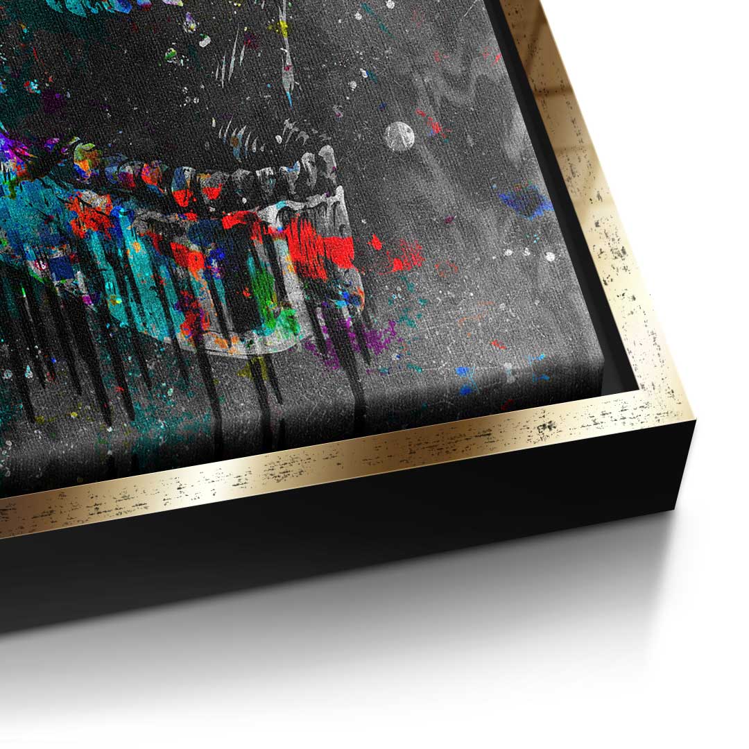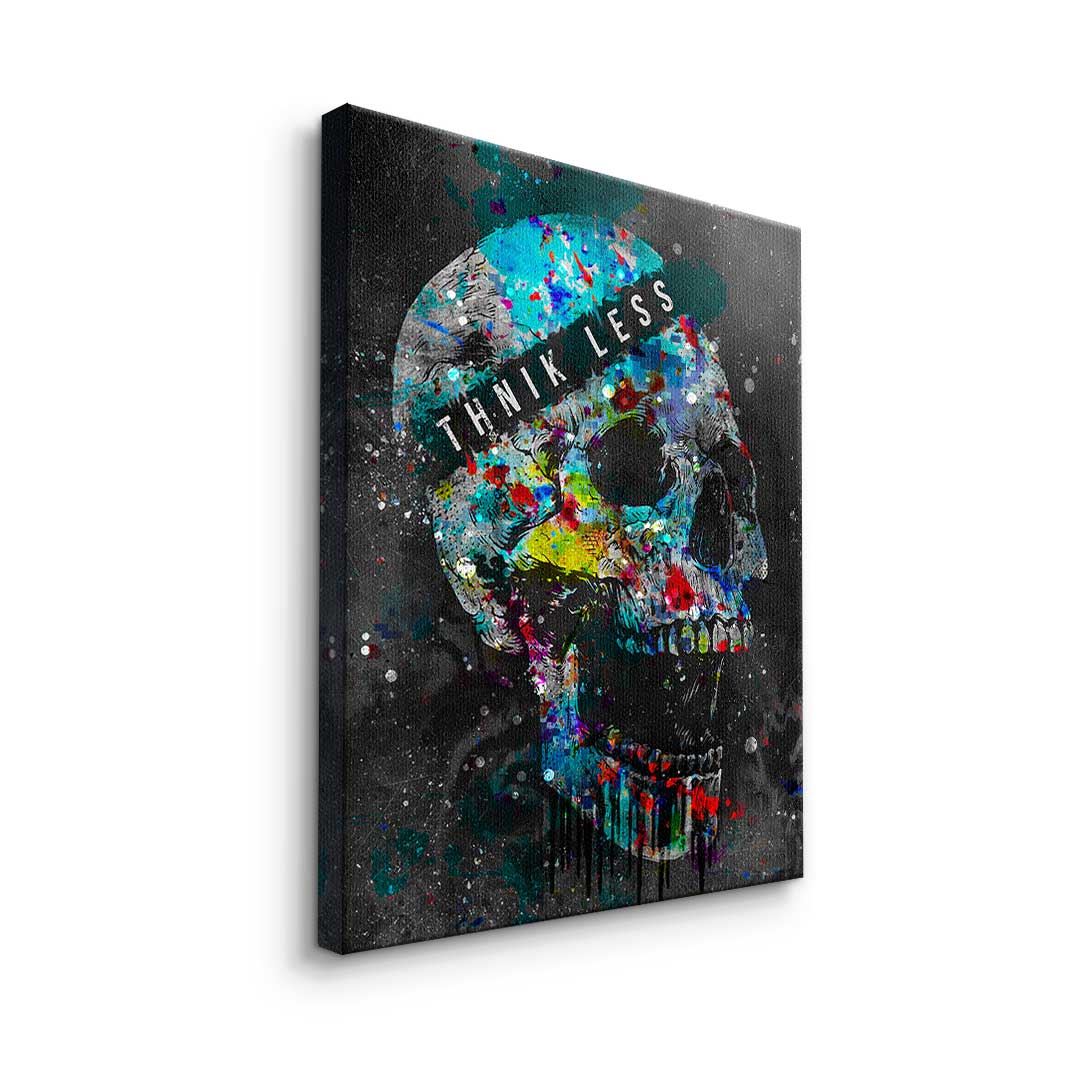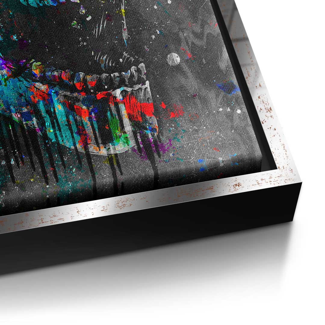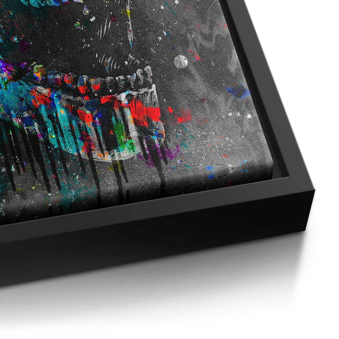 DOTCOMCANVAS® Premium Leinwandbild im Pop Art Stil mit buntem Totenkopf und Motivationsspruch.
