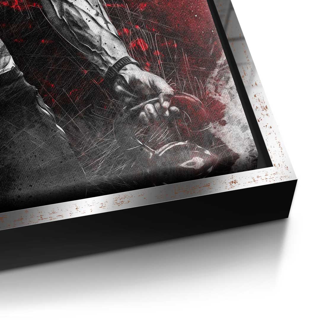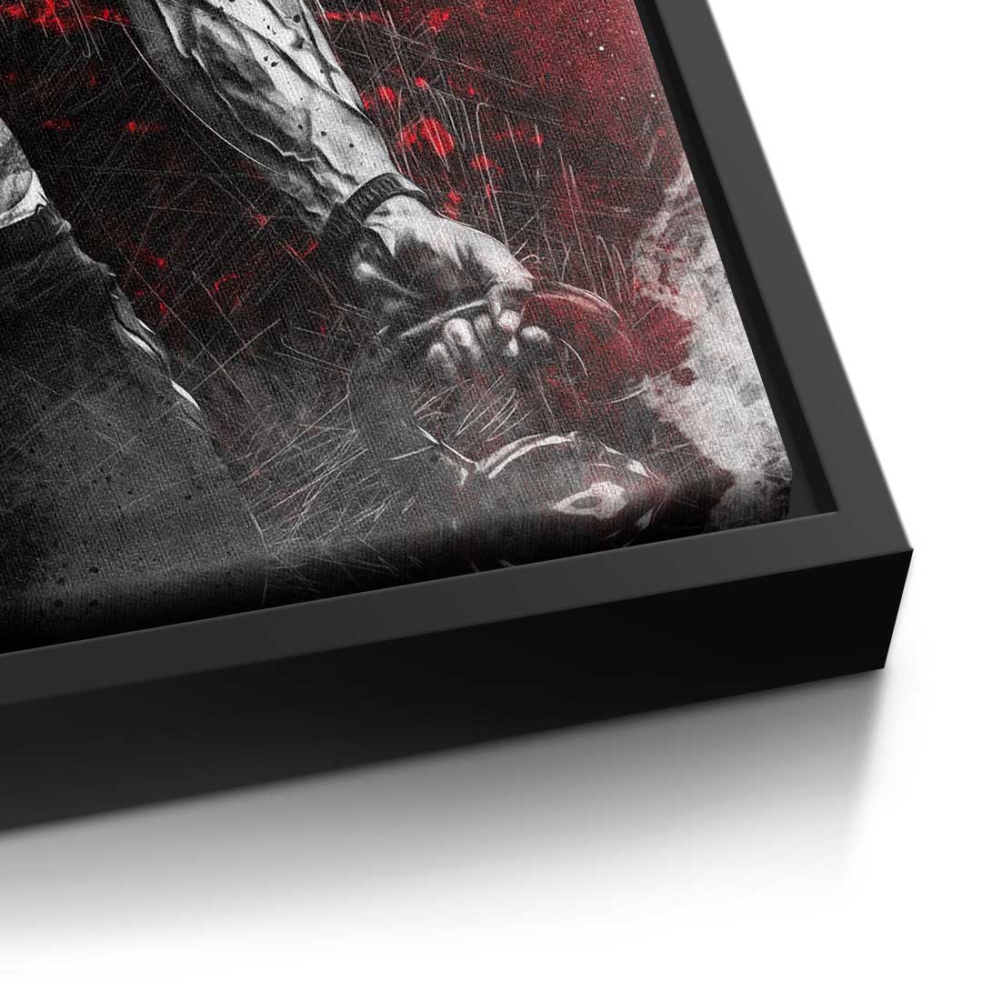 DOTCOMCANVAS® Premium Leinwandbild mit motivierendem Schriftzug "TRAIN LIKE A BEAST" und Bodybuilder in Rot, Silber und Schwarz.