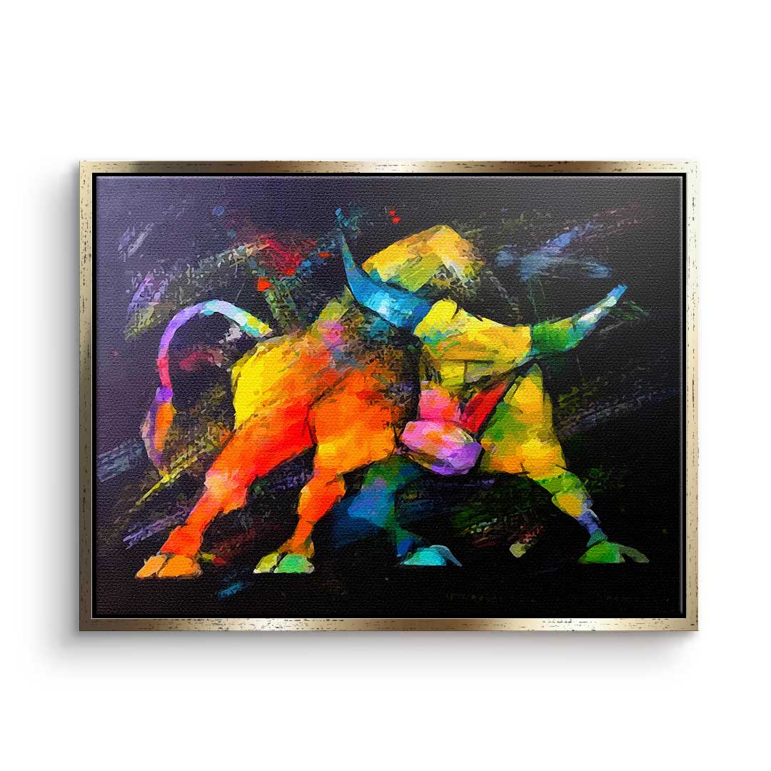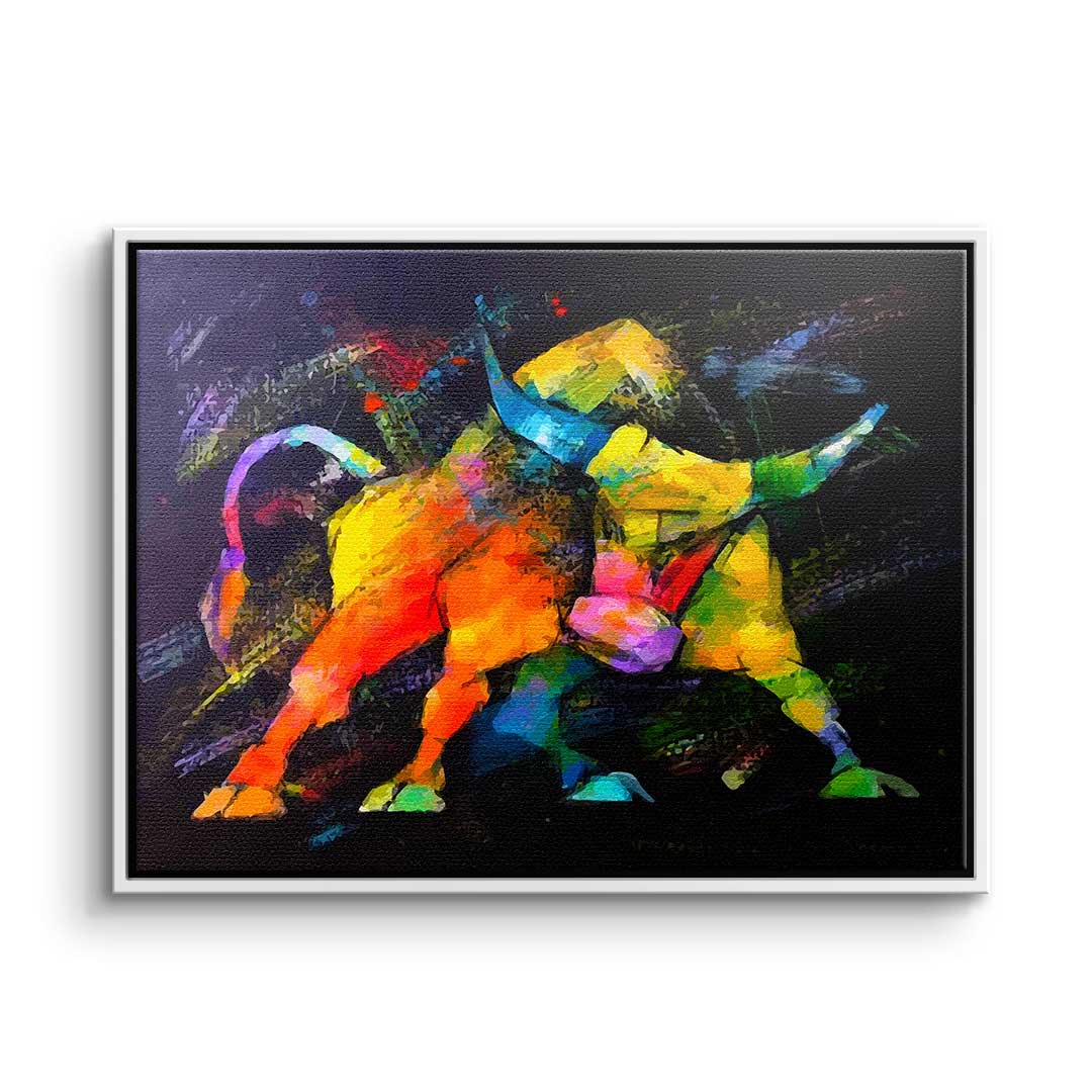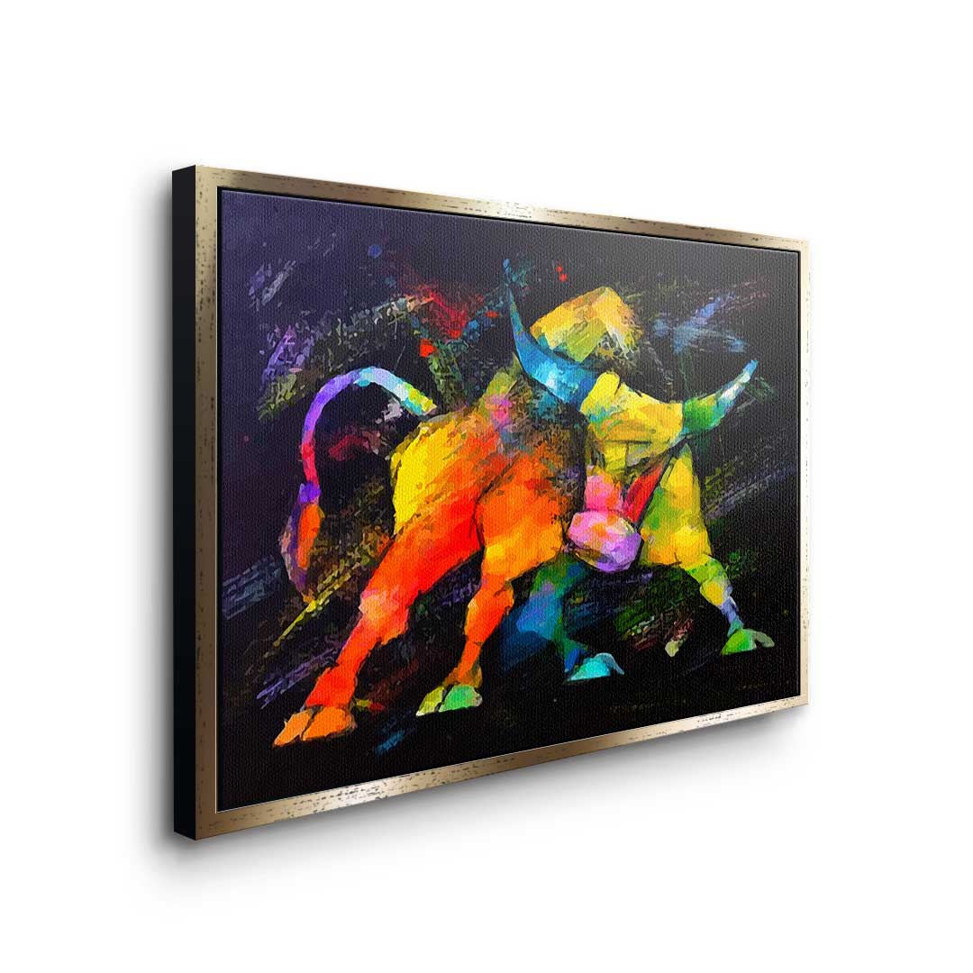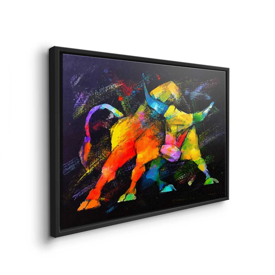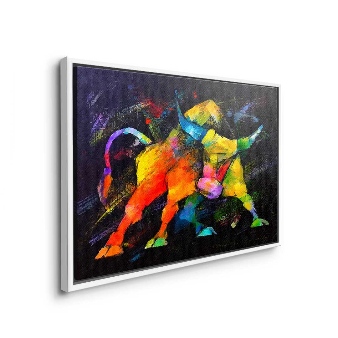 DOTCOMCANVAS®Premium Leinwandbild im Pop Art Stil mit wildem Bulle in bunten Farben.